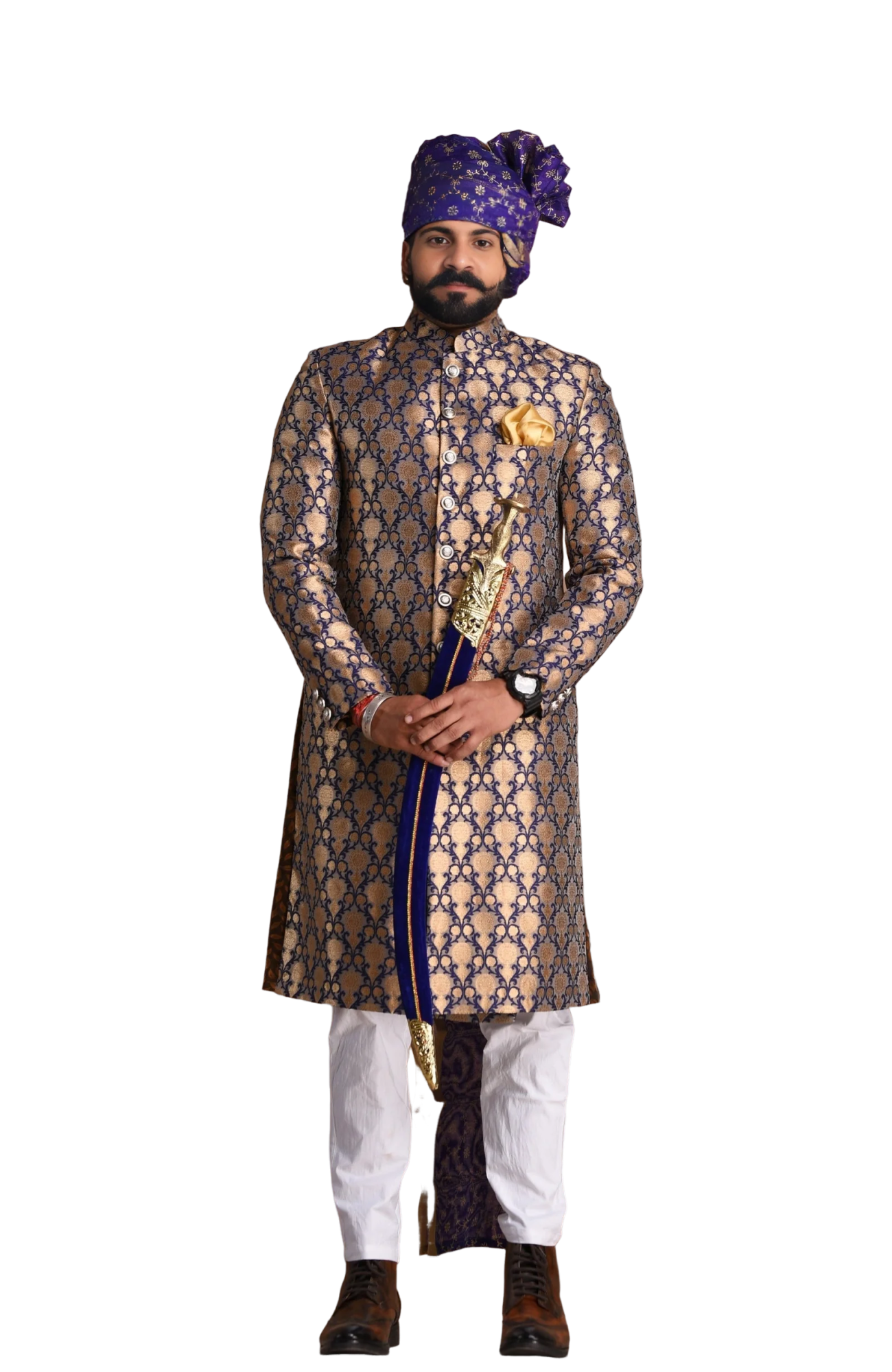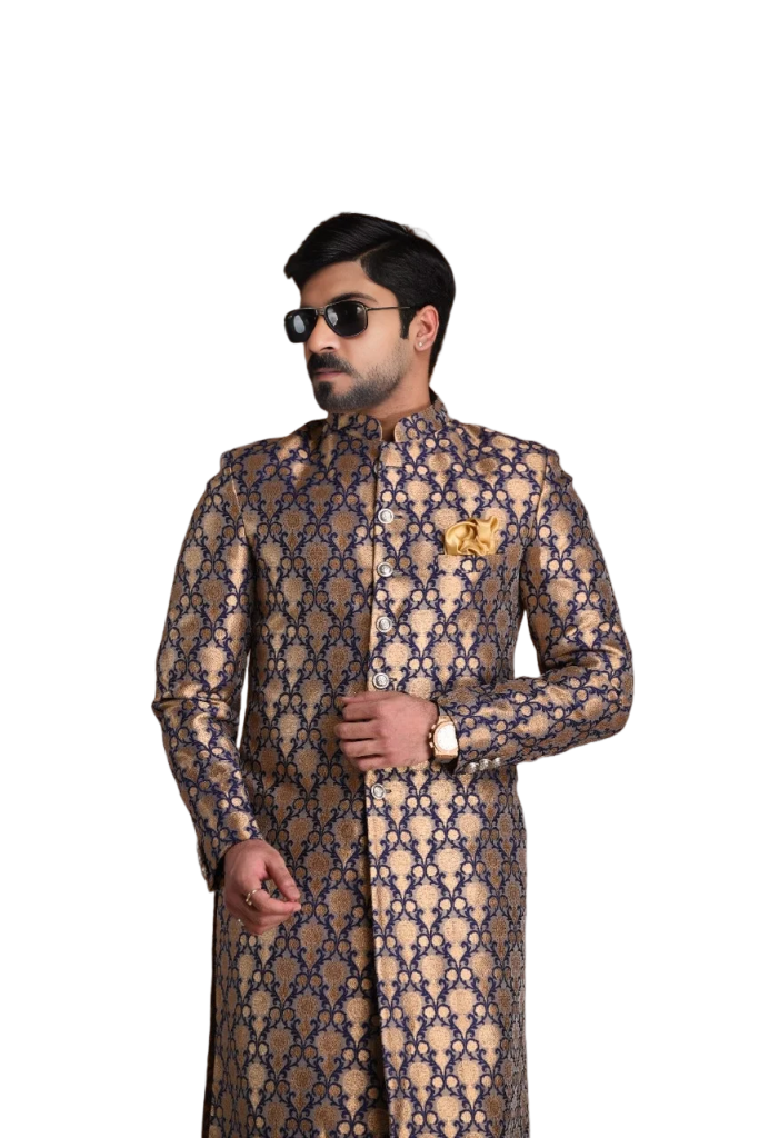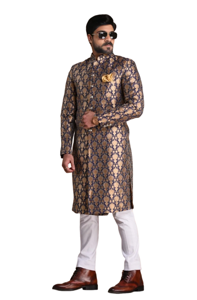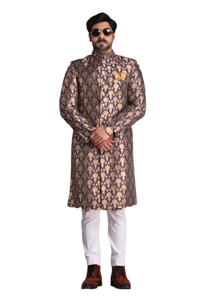 🎯 Why Handmade Navy Blue Golden Brocade Achkan Defines Sophisticated Command
