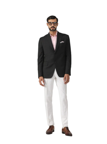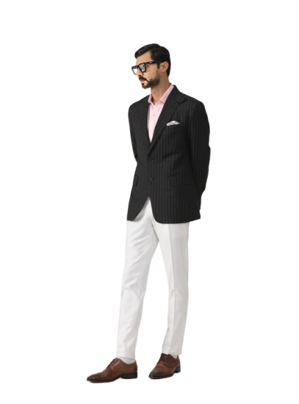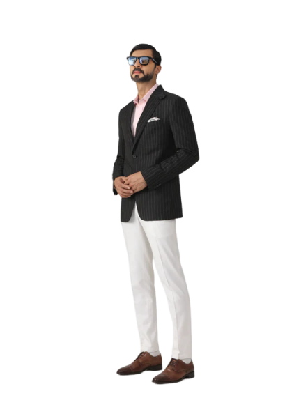 The Elite Traveller's Pinstripe Wool Jacket is incredibly versatile and can be styled in various ways: