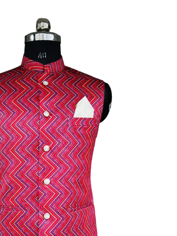 The zigzag fusion represents carefully planned design innovation that enhances rather than disrupts the classic Modi jacket elegance. The pattern is strategically placed to create visual interest and contemporary appeal while preserving the dignified silhouette that makes Modi jackets appropriate for professional settings. The fusion approach ensures the innovative elements add sophistication rather than creating distraction or inappropriate casualness for formal occasions.