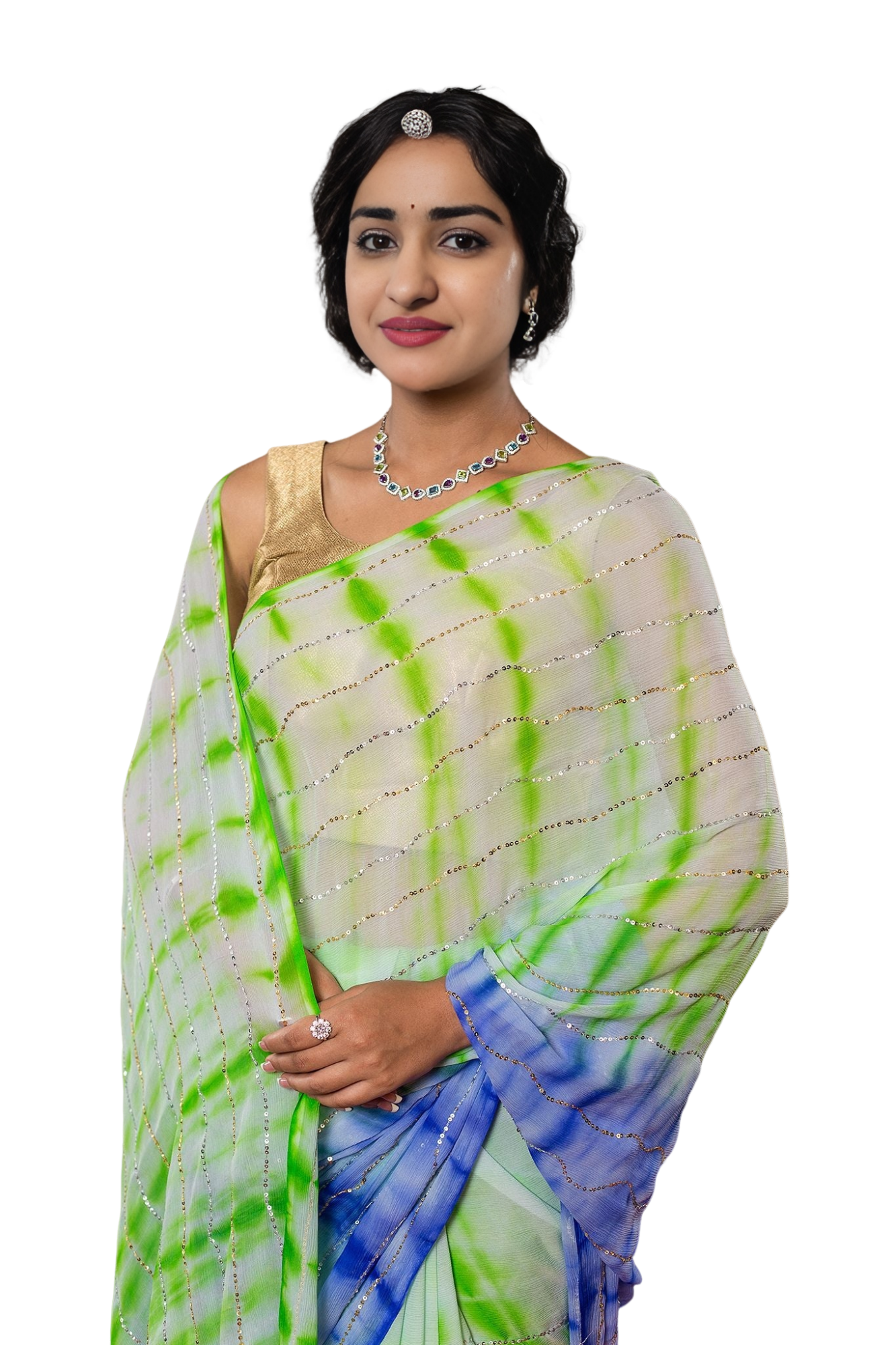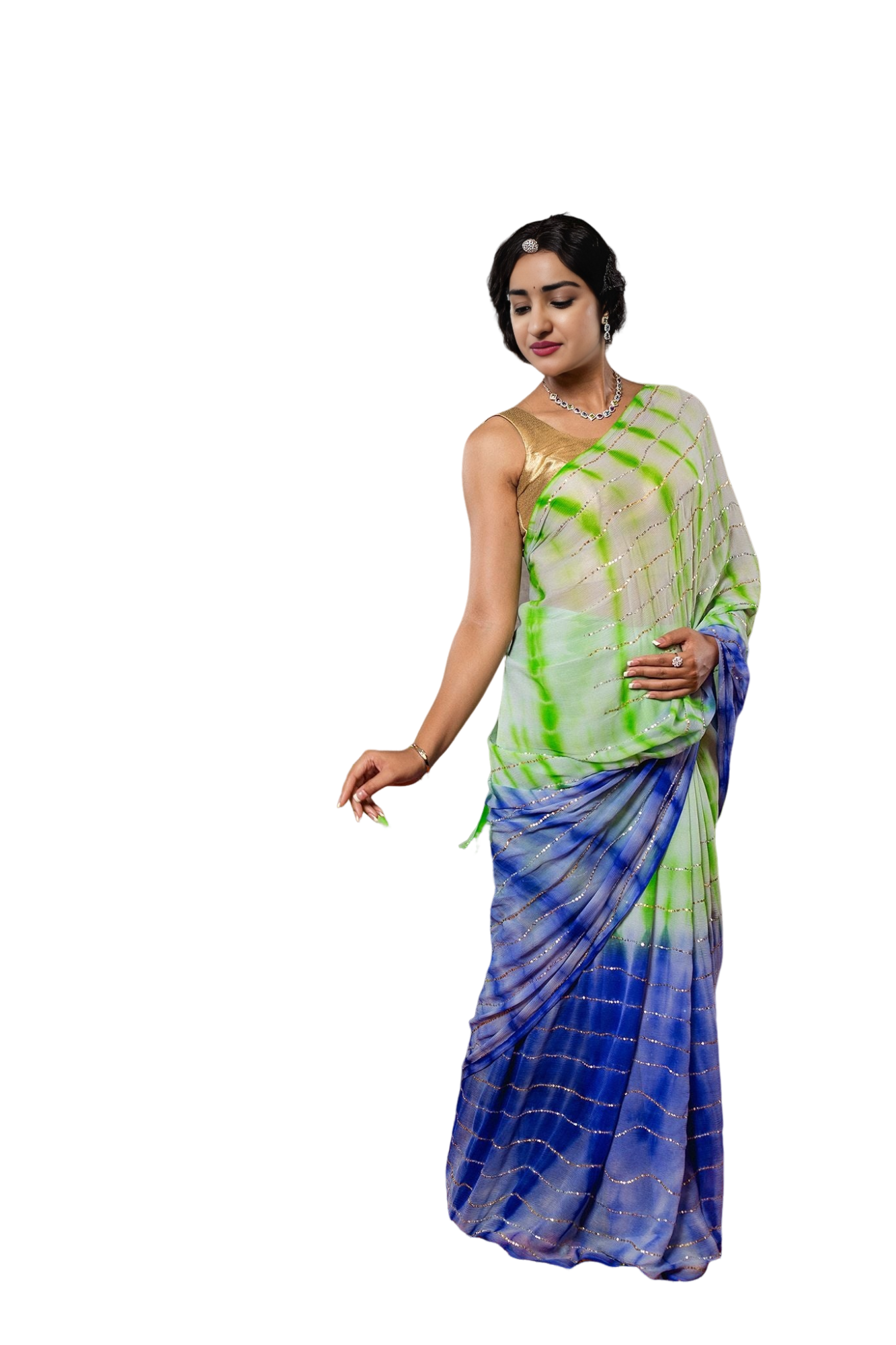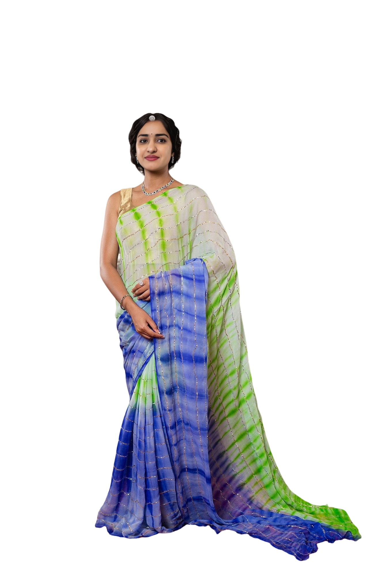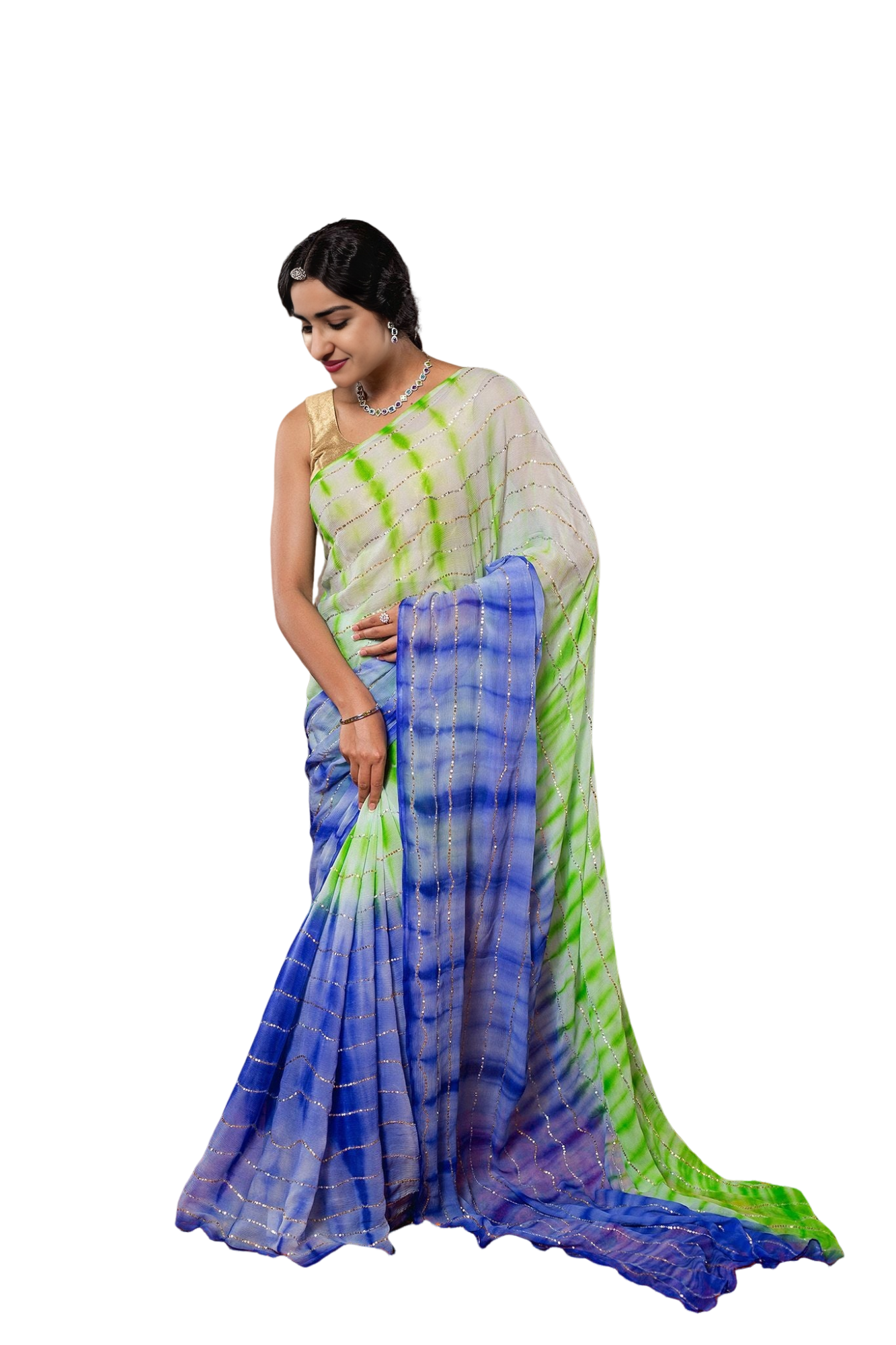 ✨ Experience elegance with our Mint Green & Blue Shaded Lehariya Saree. Featuring sparkling sequin work on premium 20gm georgette fabric. The stunning shade transition from mint green to blue creates a refreshing look. Perfect for celebrations.