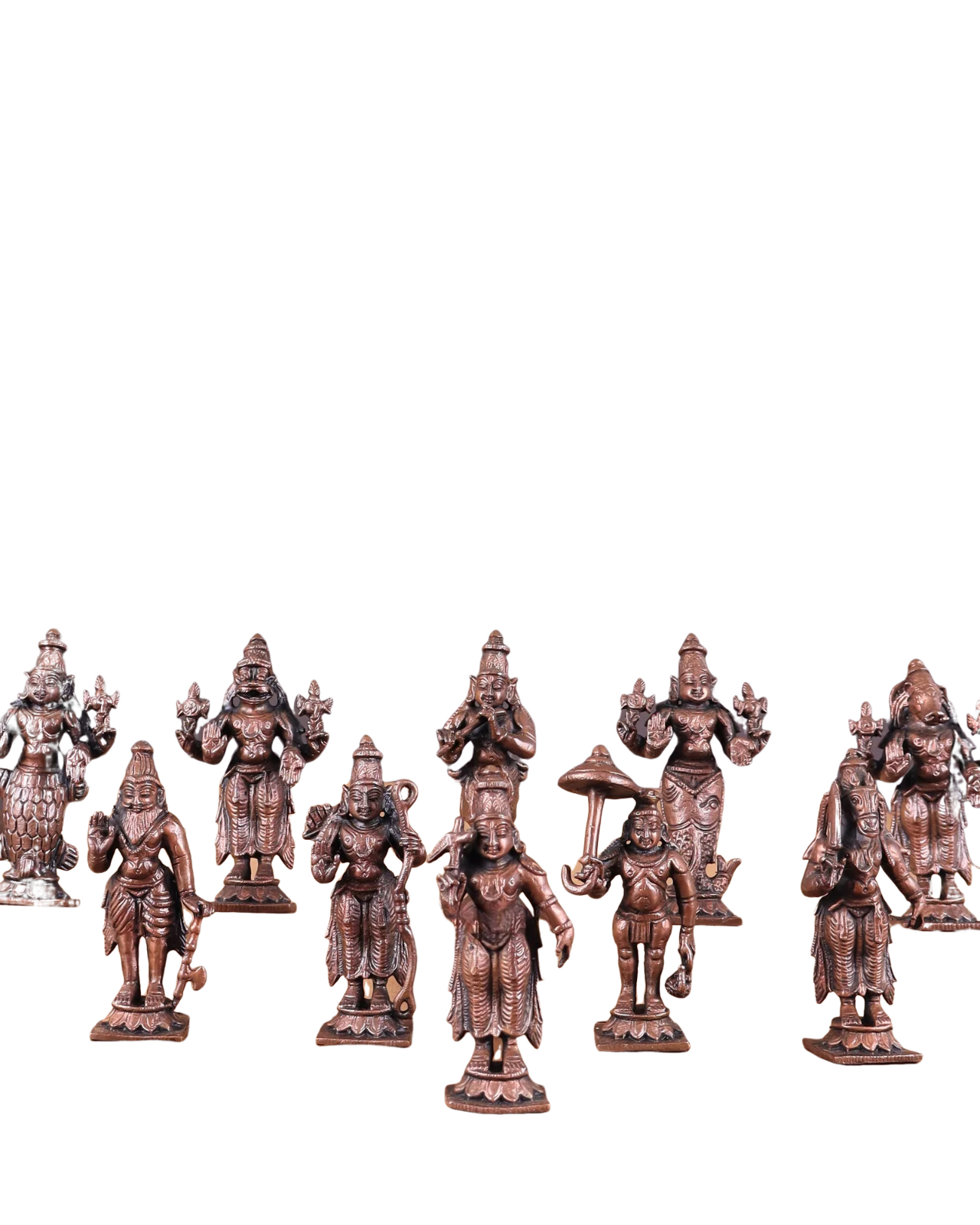 Yes! You receive the complete traditional Dashavatar collection: Matsya (Fish), Kurma (Tortoise), Varaha (Boar), Narasimha (Lion-Man), Vamana (Dwarf), Parashurama (Warrior-Sage), Rama (Prince), Krishna (Cowherd), Balarama/Buddha (regional variation), and Kalki (Future Warrior). Each avatar is individually crafted with specific iconographic details.