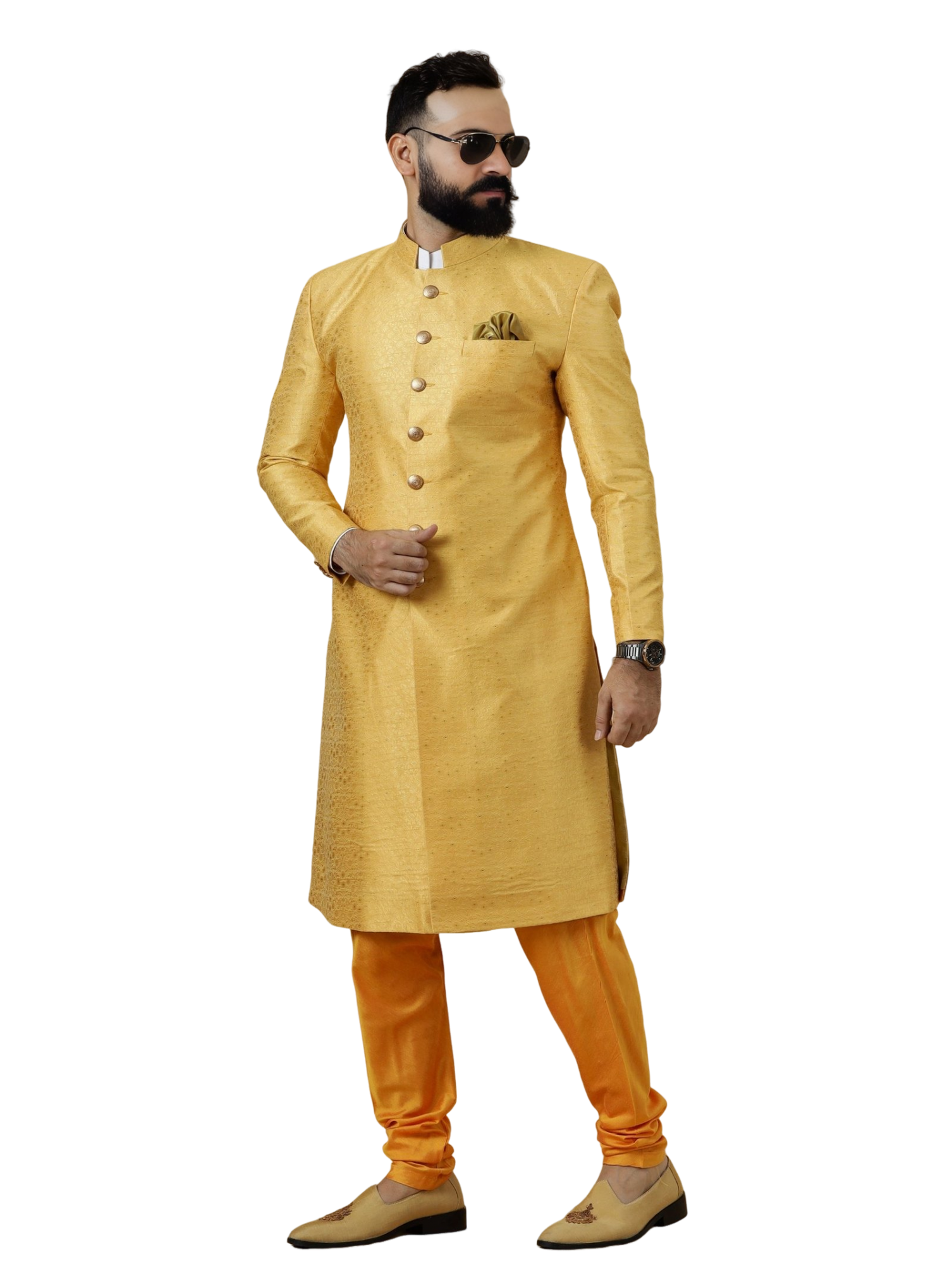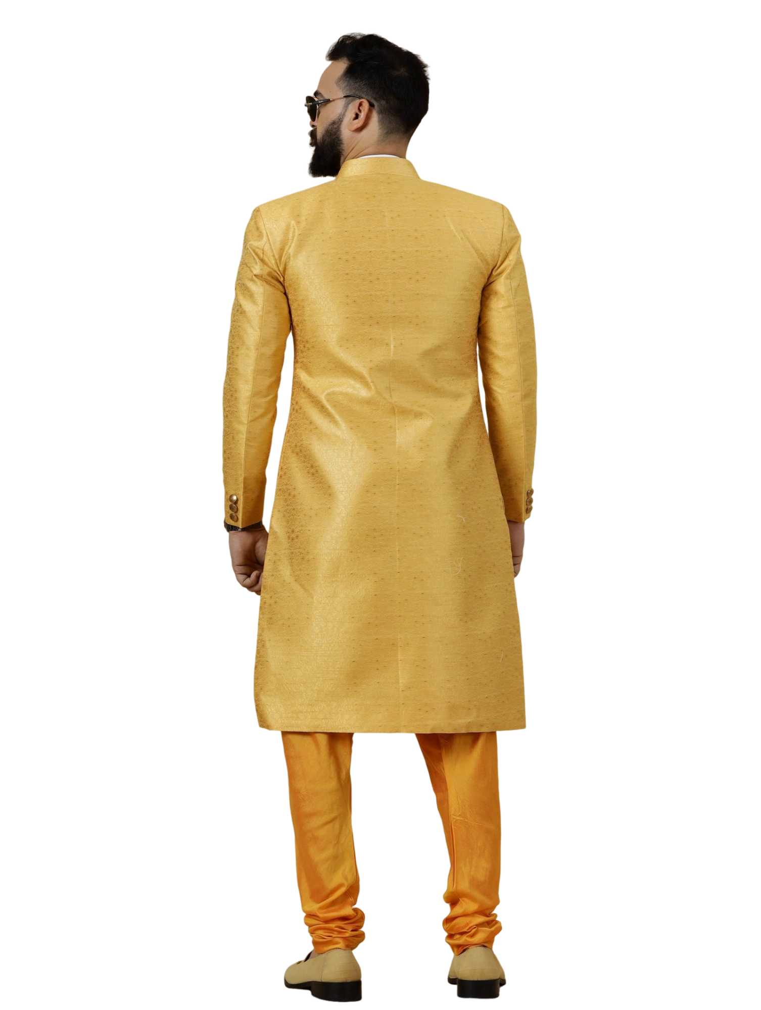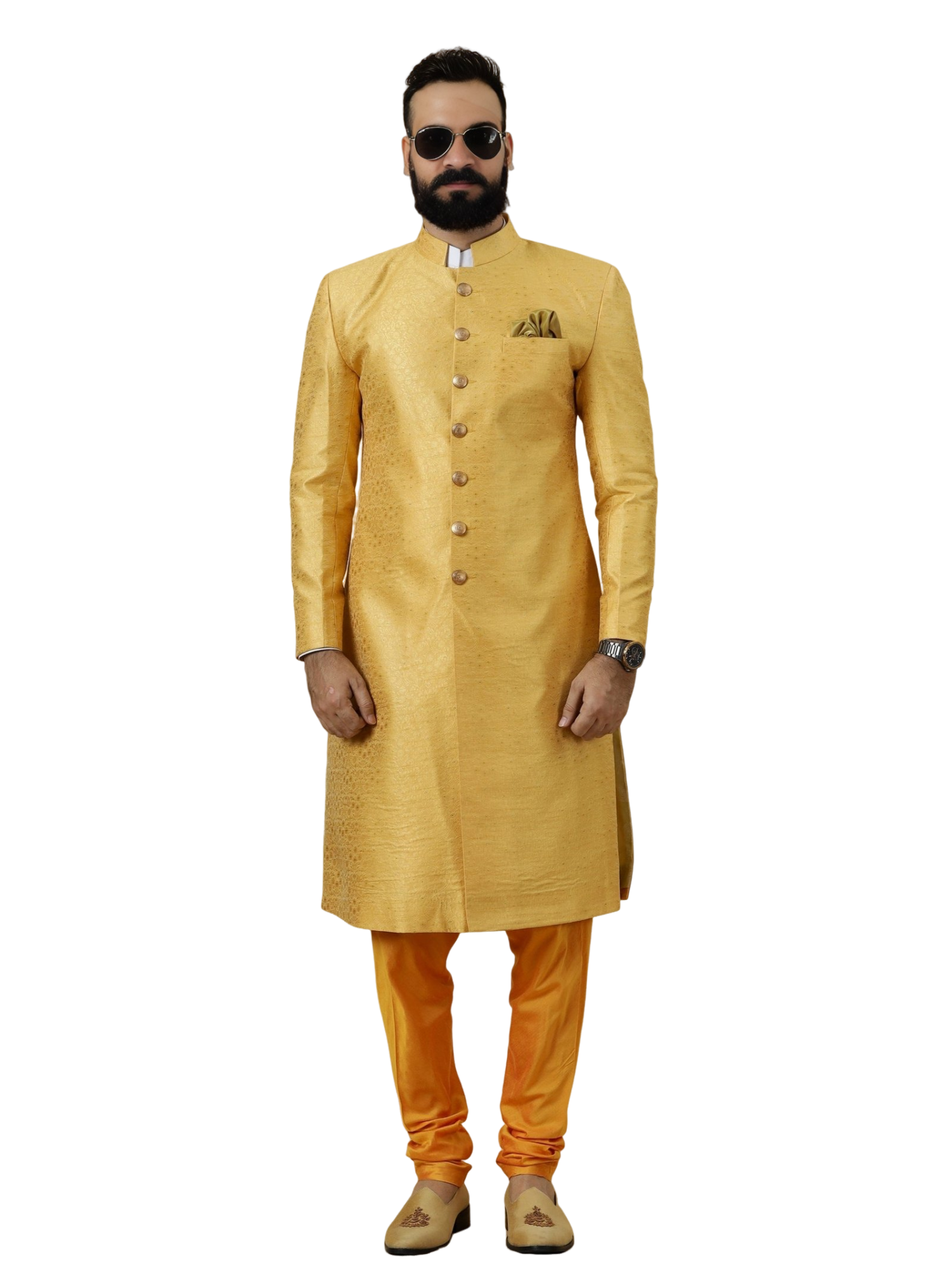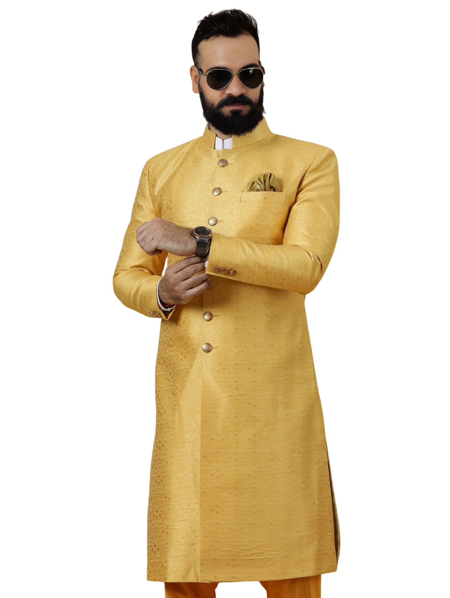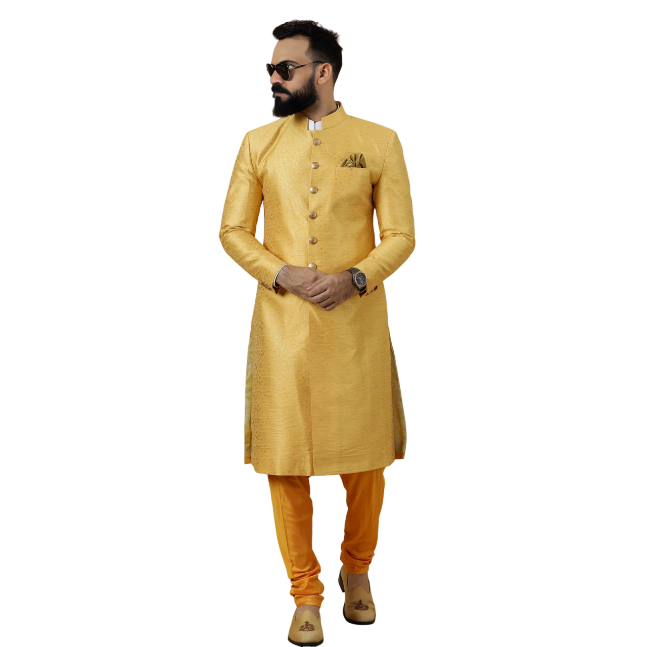 Regal Elegance Redefined: Yellow Banarasi Brocade Achkan for Men
