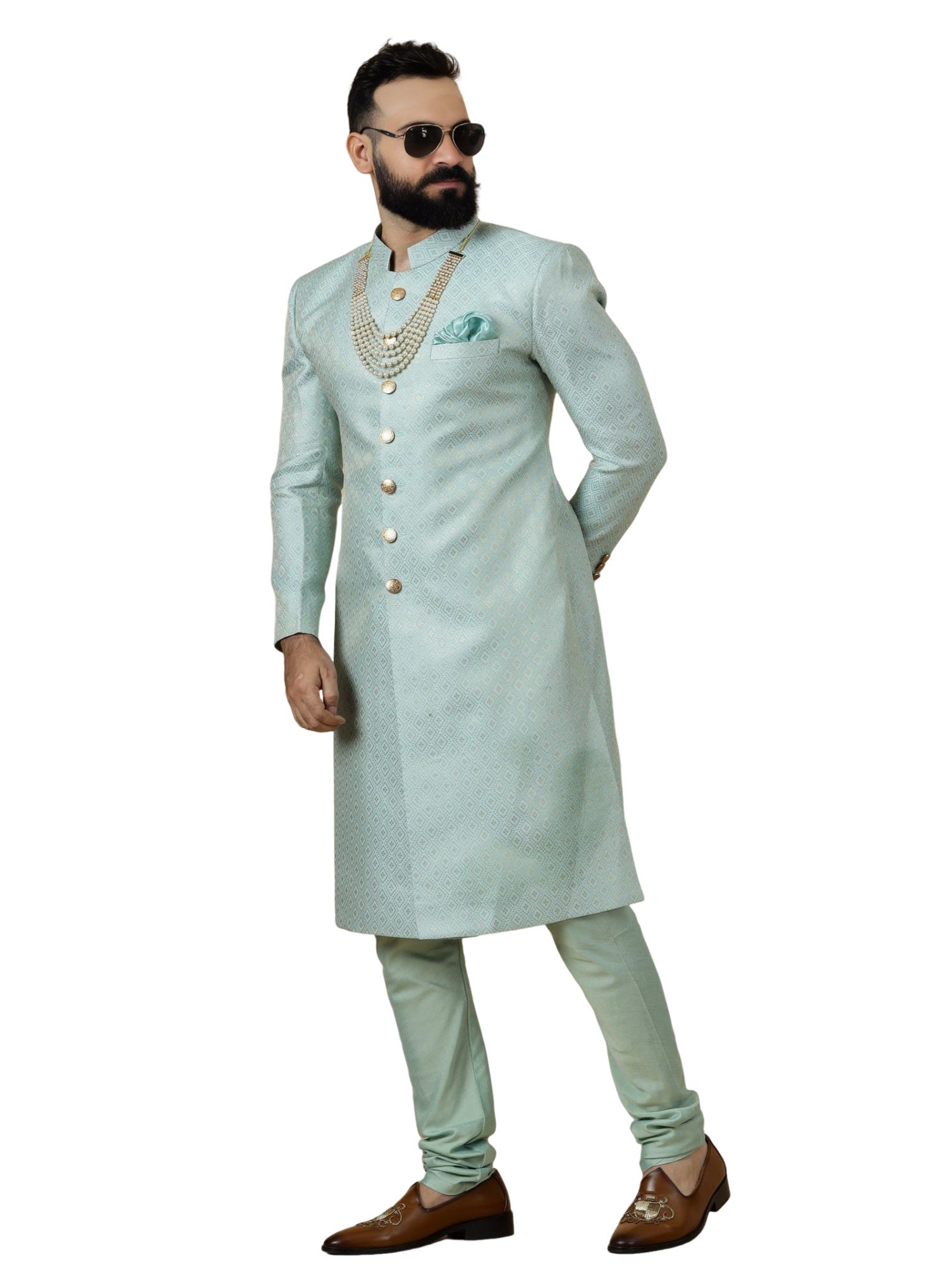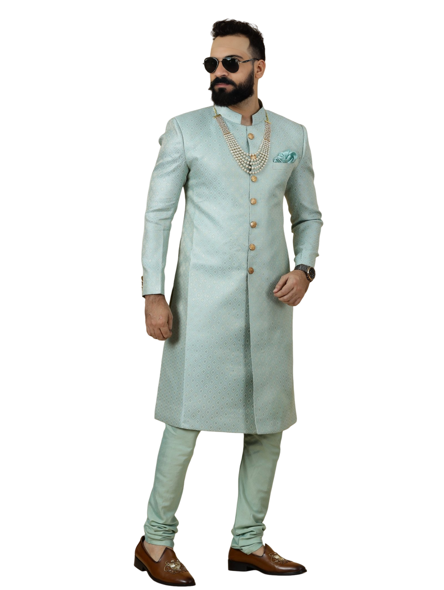 One of the standout features of this achkan is the availability of father-son combo sizes. Imagine the heartwarming sight of father and son dressed in matching sea foam achkans, creating a precious memory that will be treasured for years to come. The father-son combo is perfect for weddings, festivals, or any occasion that calls for a touch of traditional elegance.