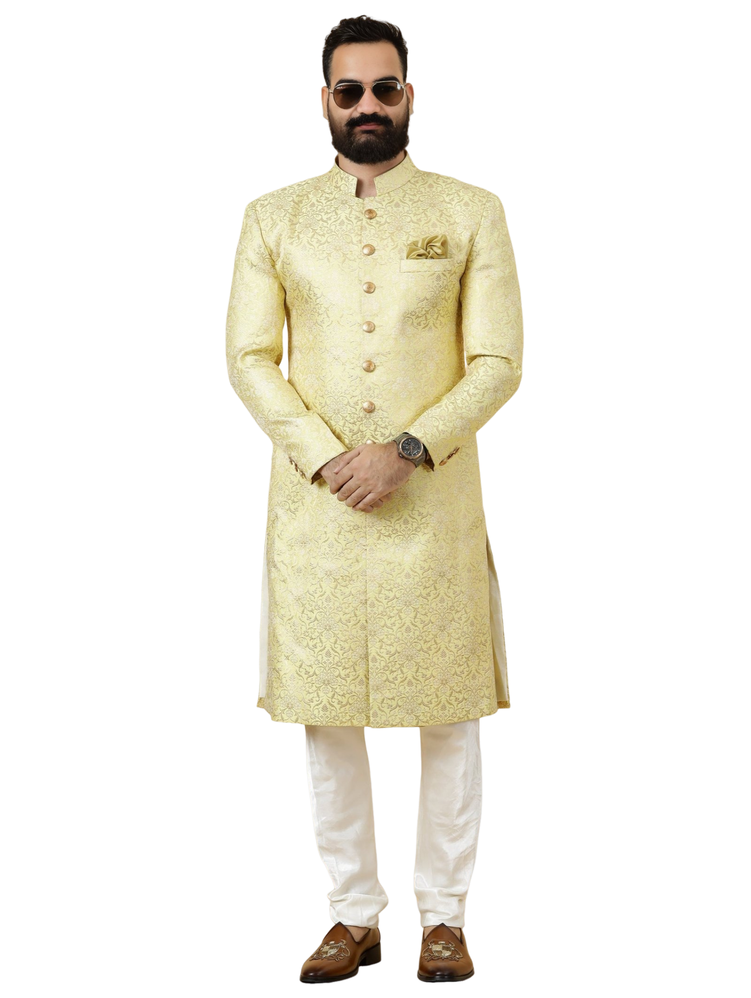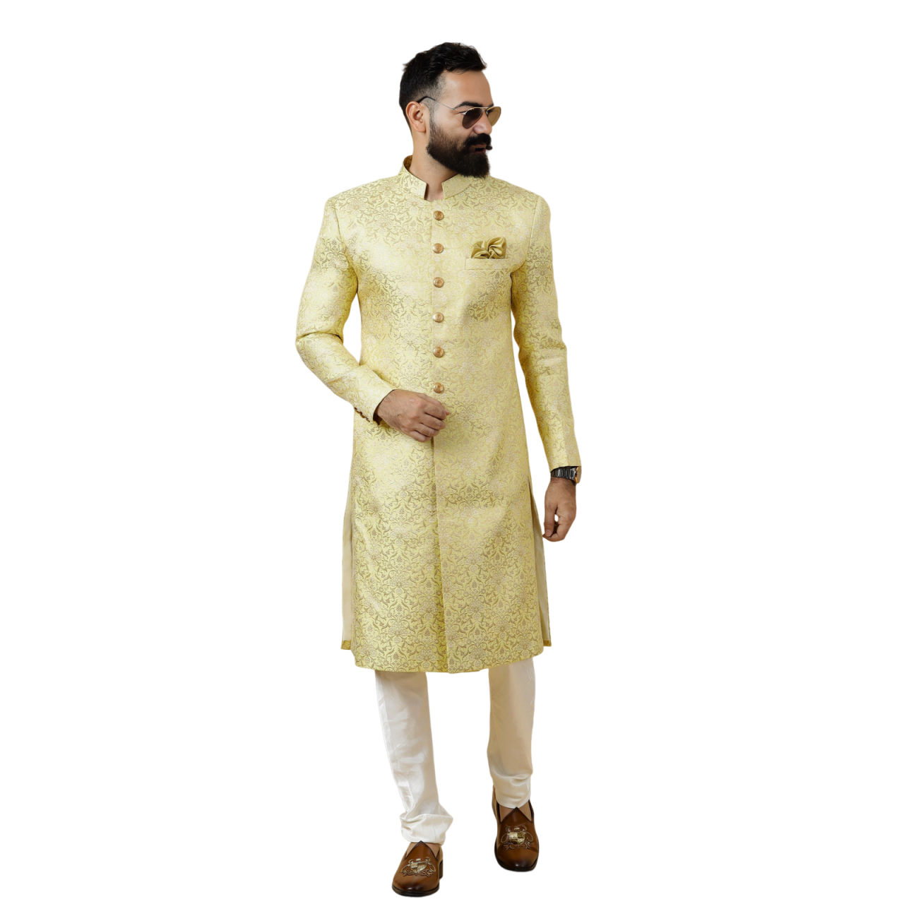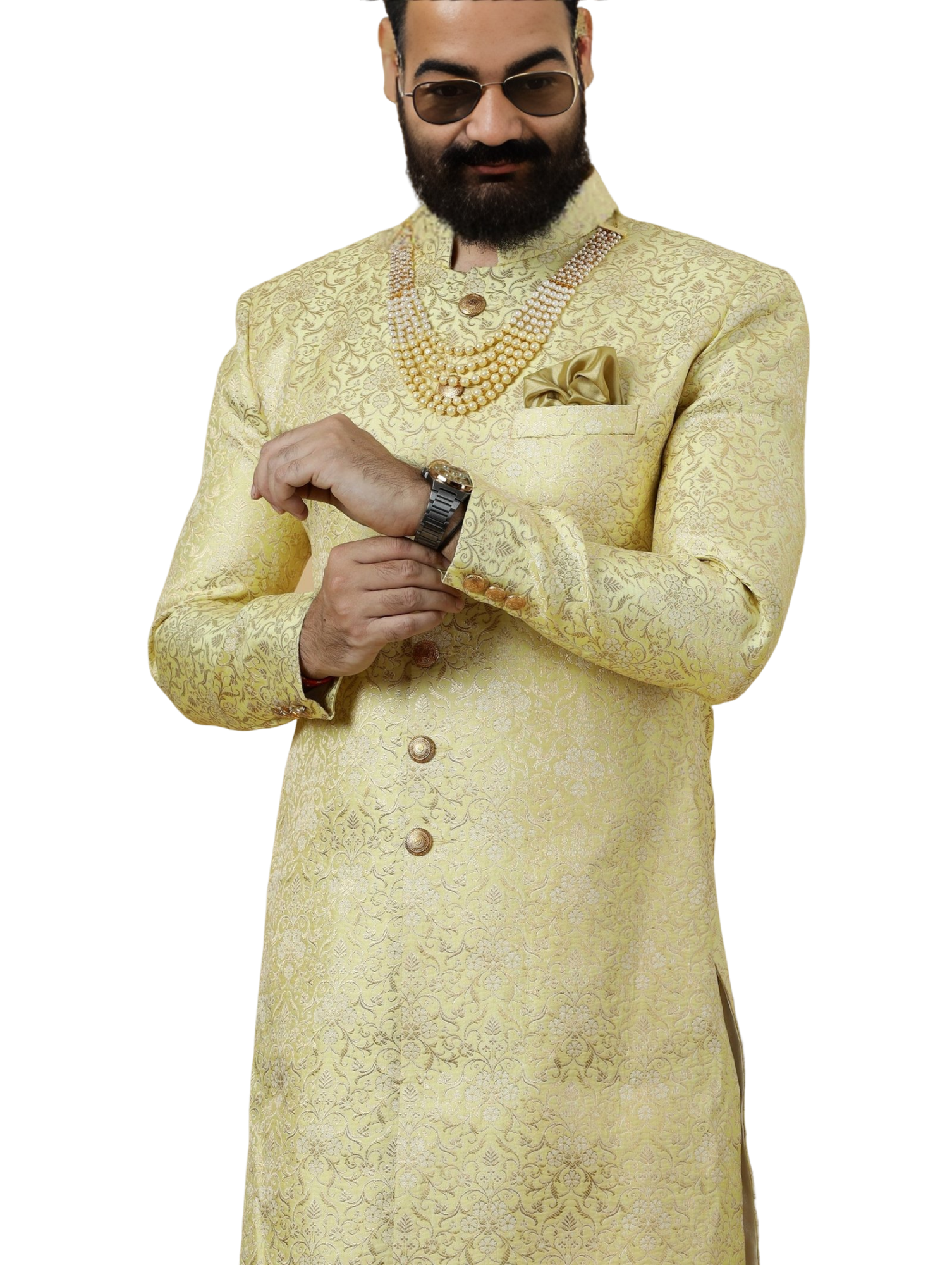 Experience the richness of Banarasi craftsmanship with our Yellow Brocade Achkan. Each piece showcases authentic weaving techniques passed down through generations.