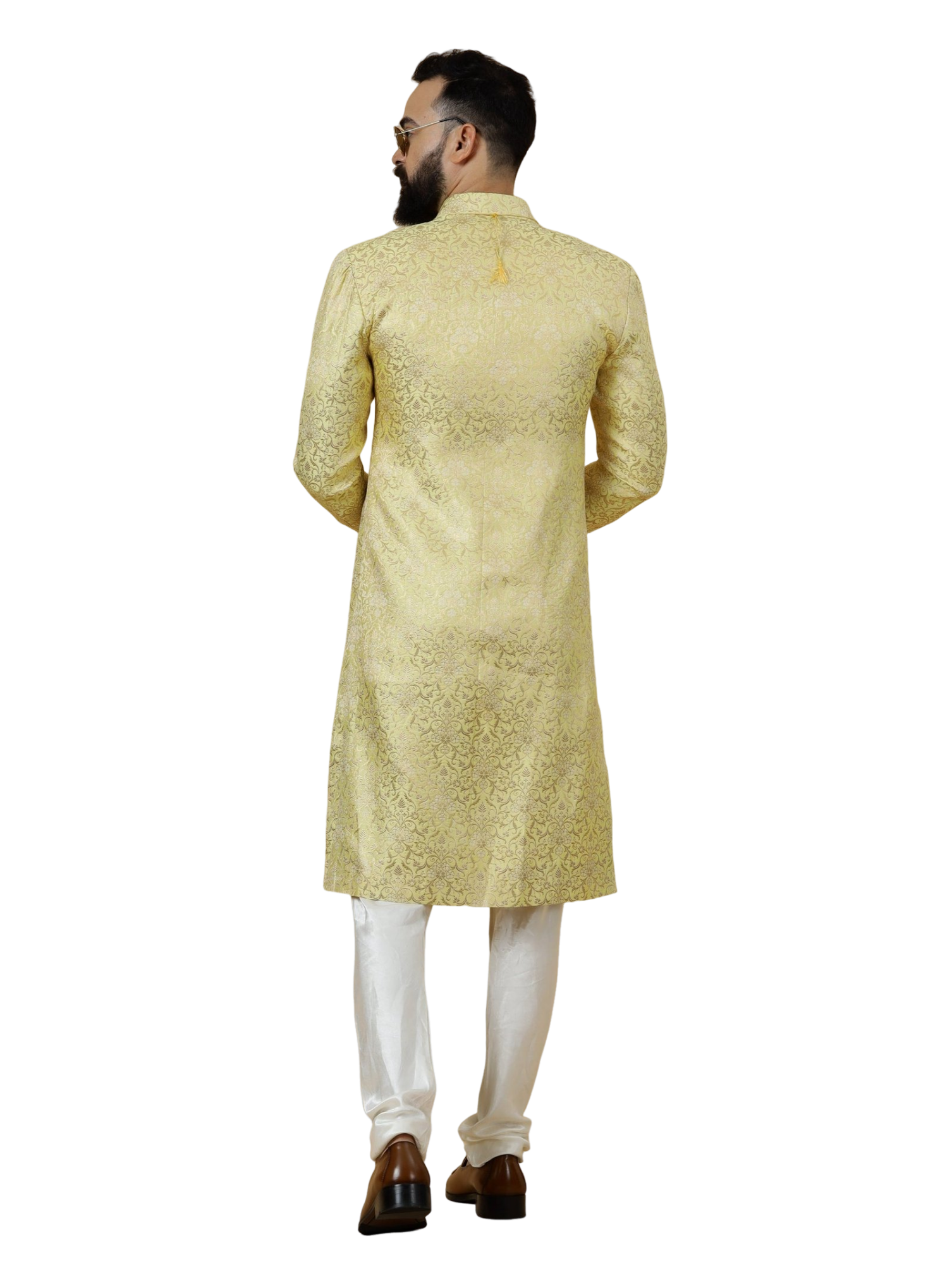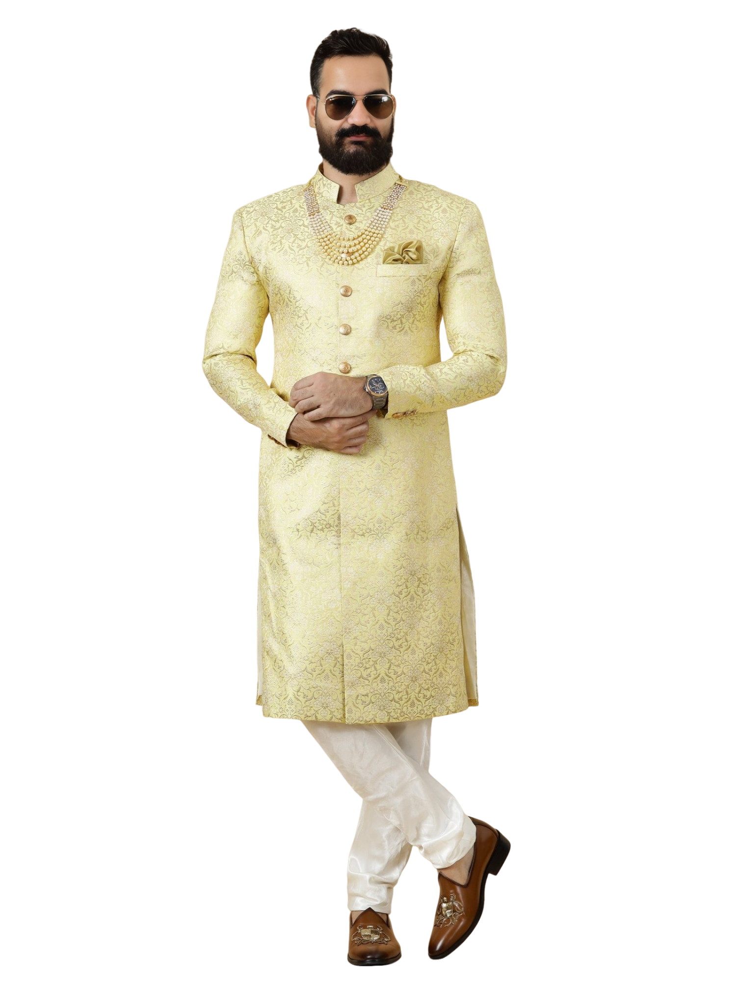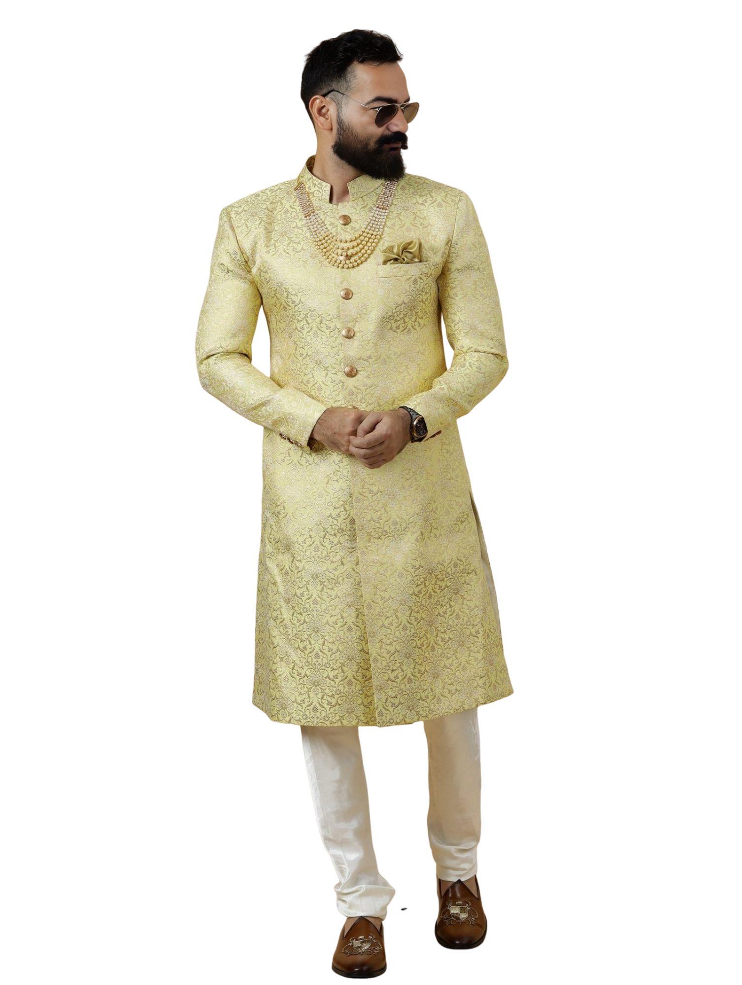 Experience the richness of Banarasi craftsmanship with our Yellow Brocade Achkan. Each piece showcases authentic weaving techniques passed down through generations.