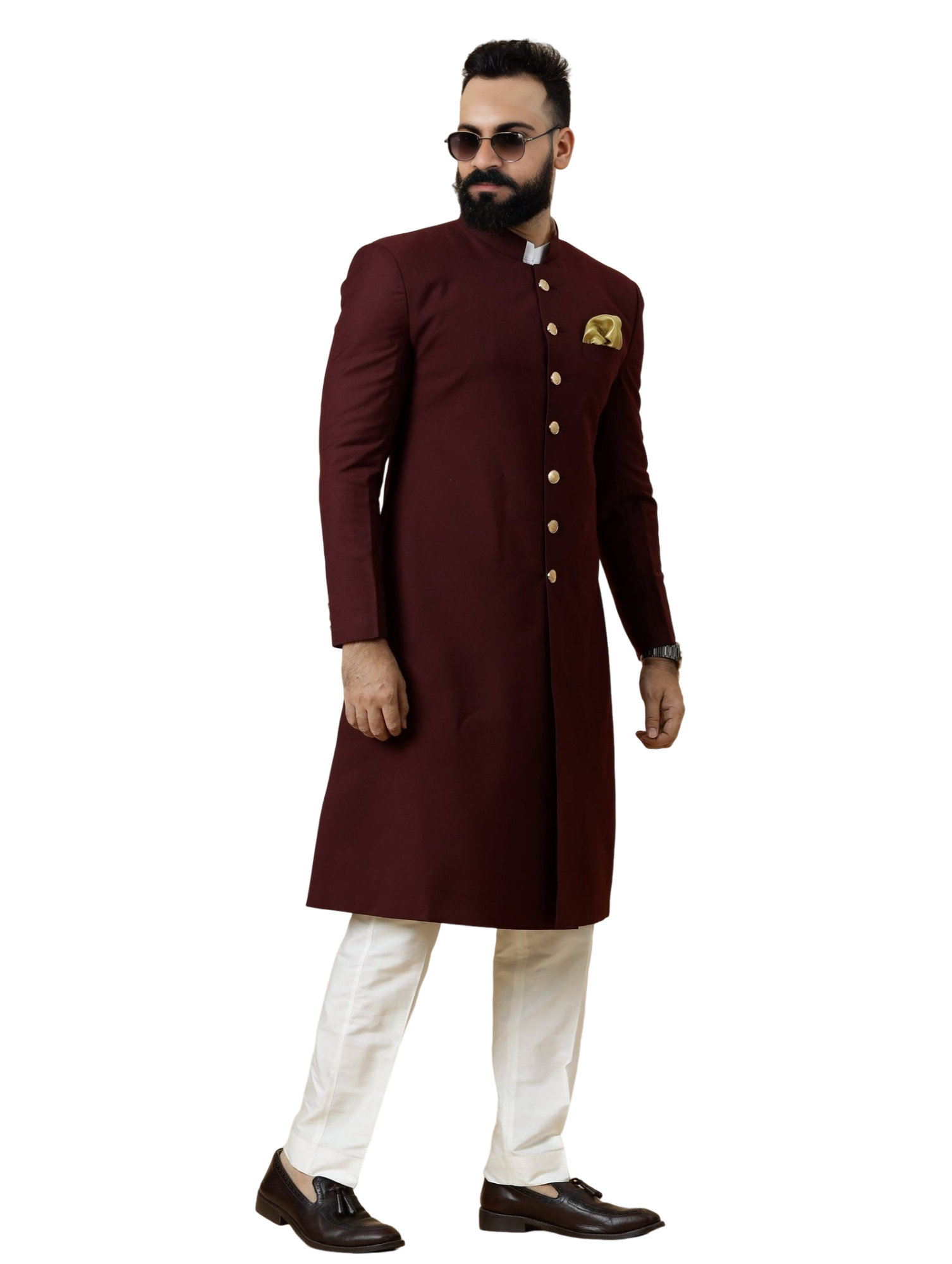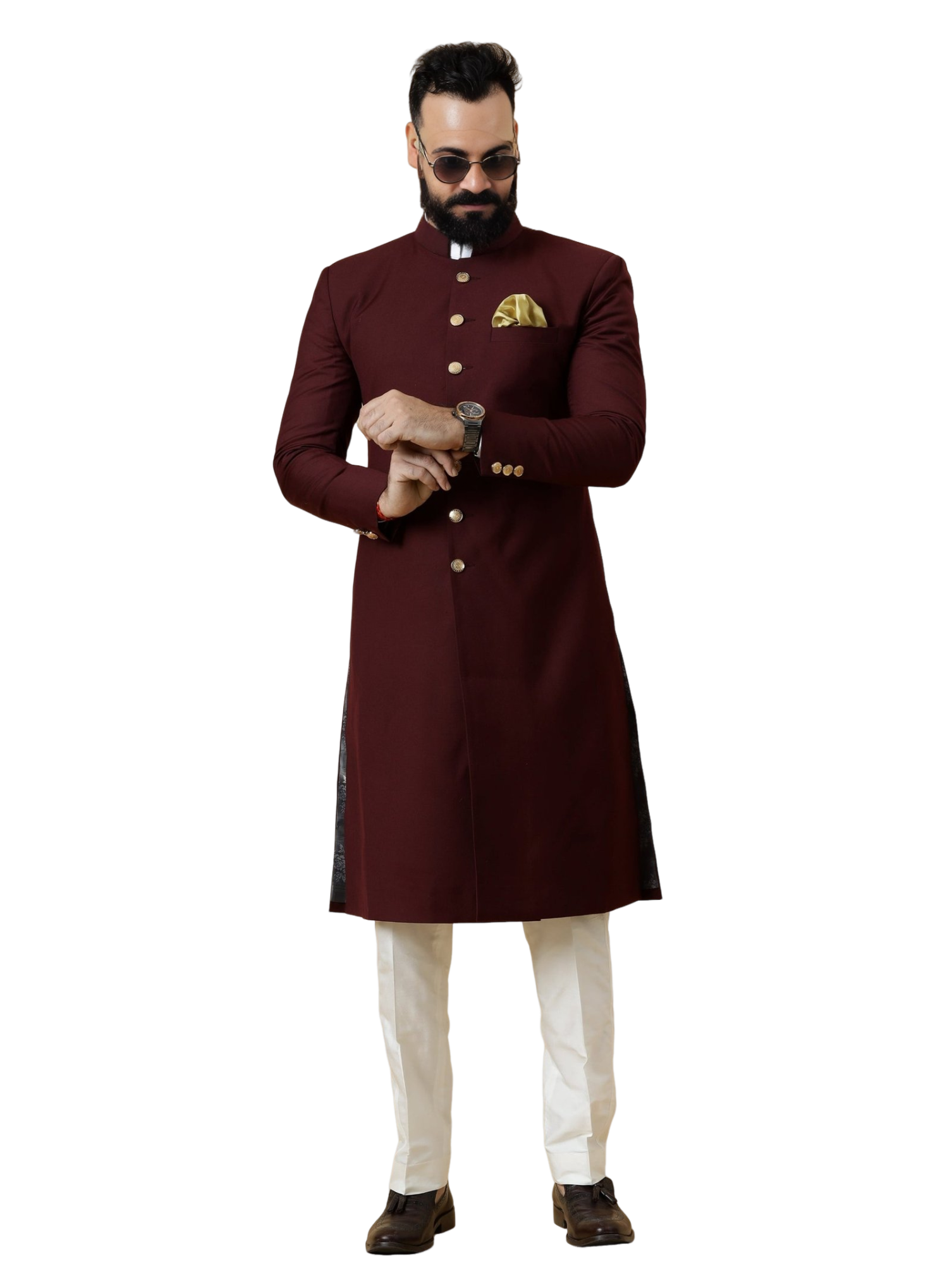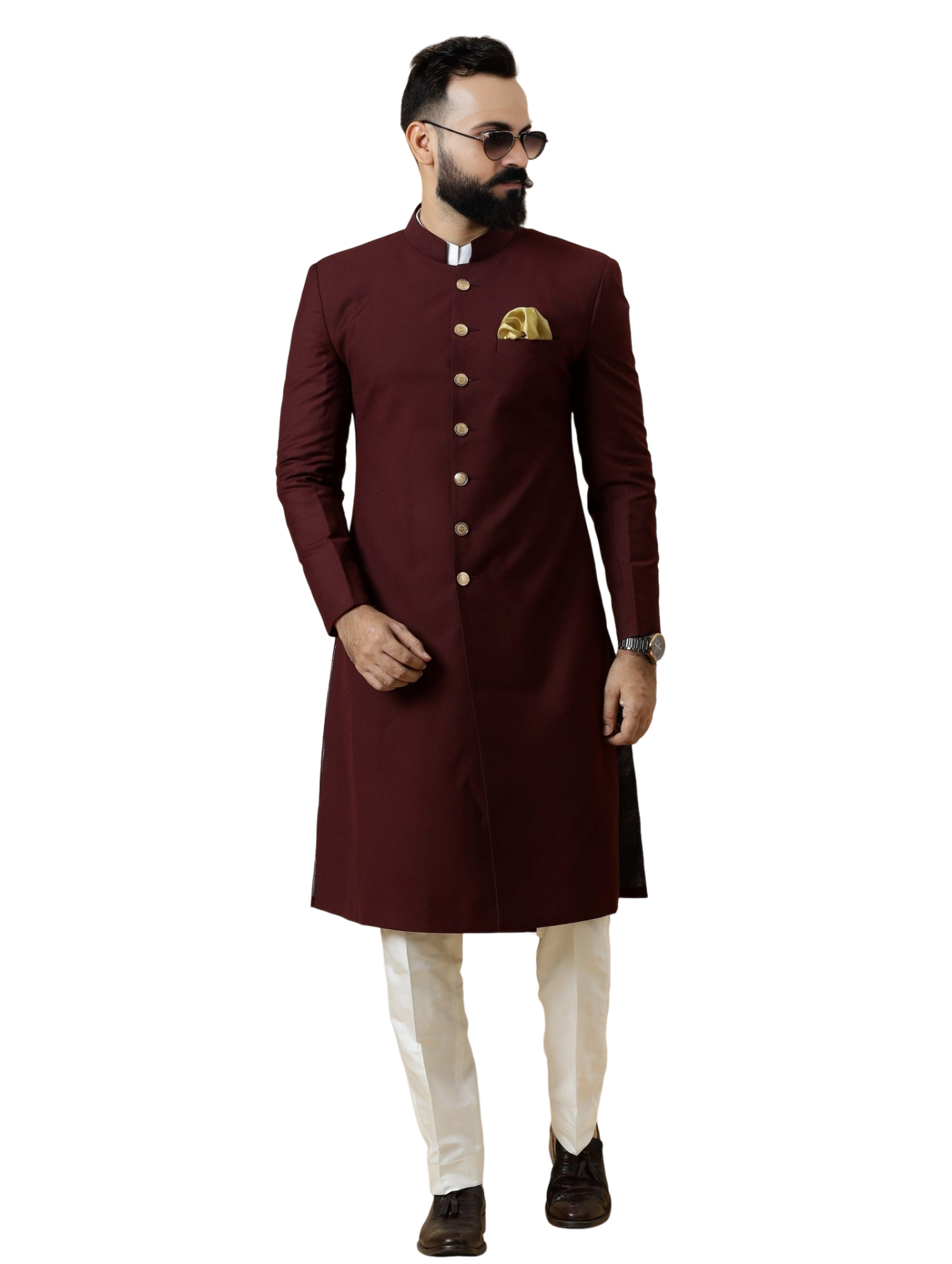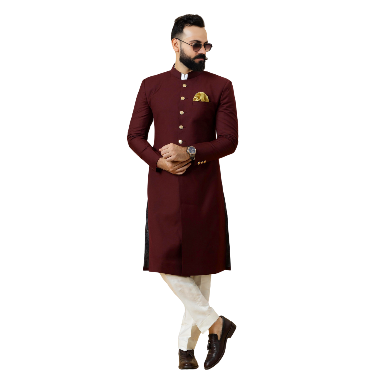 Imagine walking into a grand wedding or a high-profile event, the deep wine color of your achkan catching the light, exuding an aura of confidence and sophistication. Our skilled designers have chosen this rich hue to perfectly balance tradition with modern aesthetics. The wine color symbolizes luxury, depth, and maturity, making it an ideal choice for men who want to stand out with understated elegance.