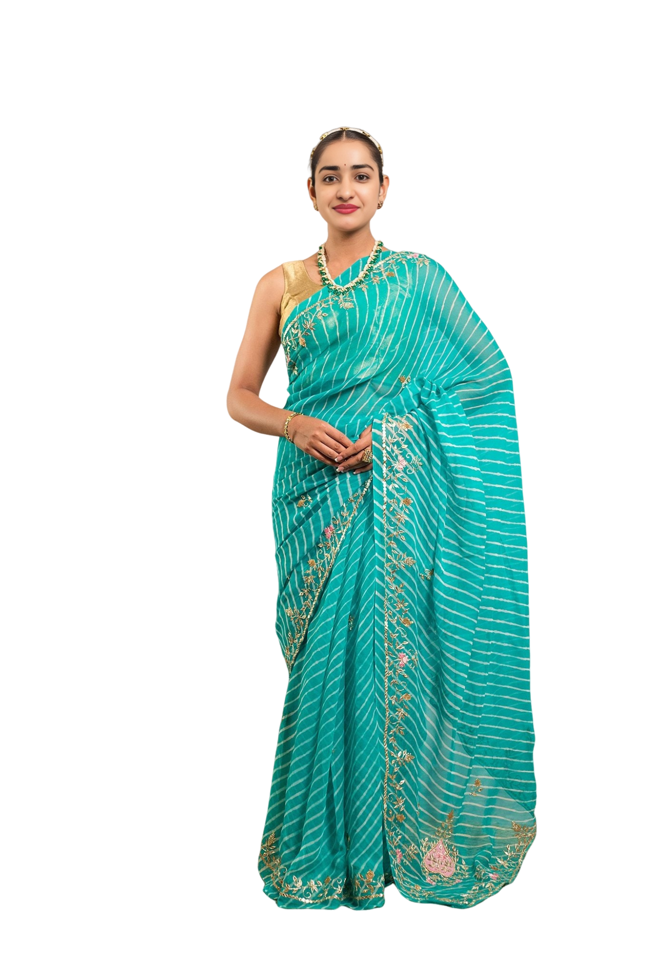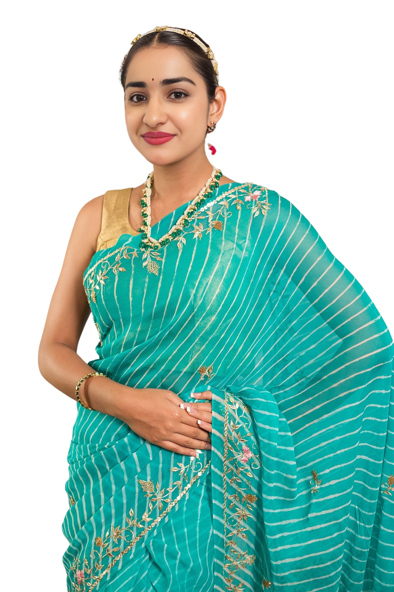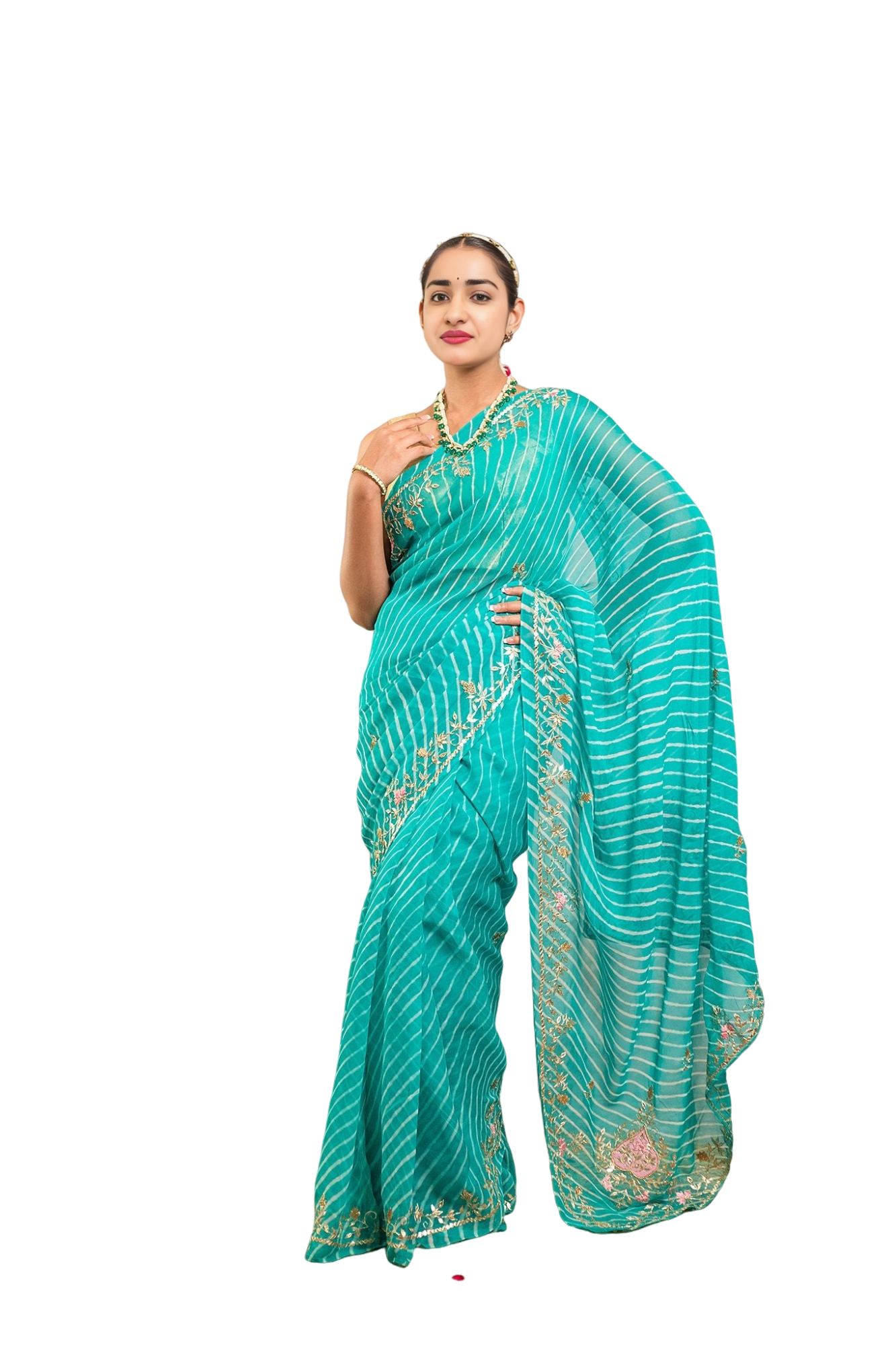 Experience the perfect fusion of traditional Lehariya pattern with exquisite Resham and Gottapati work in our Firozi Lehariya Saree.