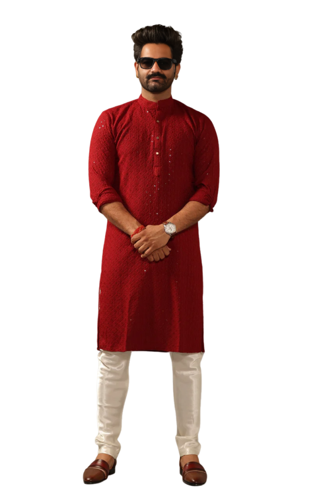 This ensemble is specifically designed for luxury occasions where cultural authenticity and imperial magnificence matter most. The ruby red color photographs beautifully under wedding lighting, the chikankaari embroidery creates stunning visual texture, and the royal craftsmanship commands respect and admiration. Many customers choose this for groom wear, reception events, and occasions where they want to honor traditional heritage while expressing sophisticated luxury taste.