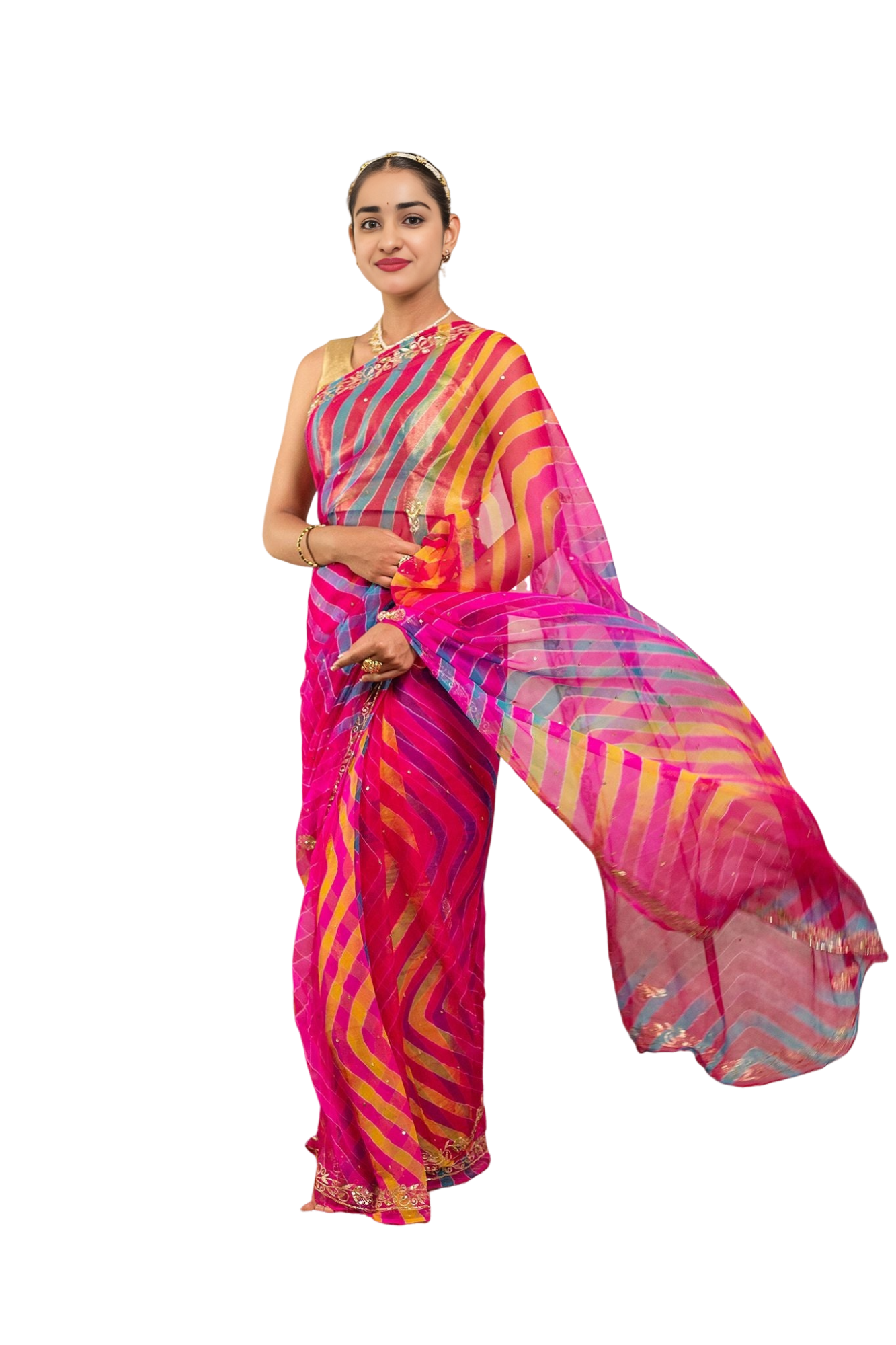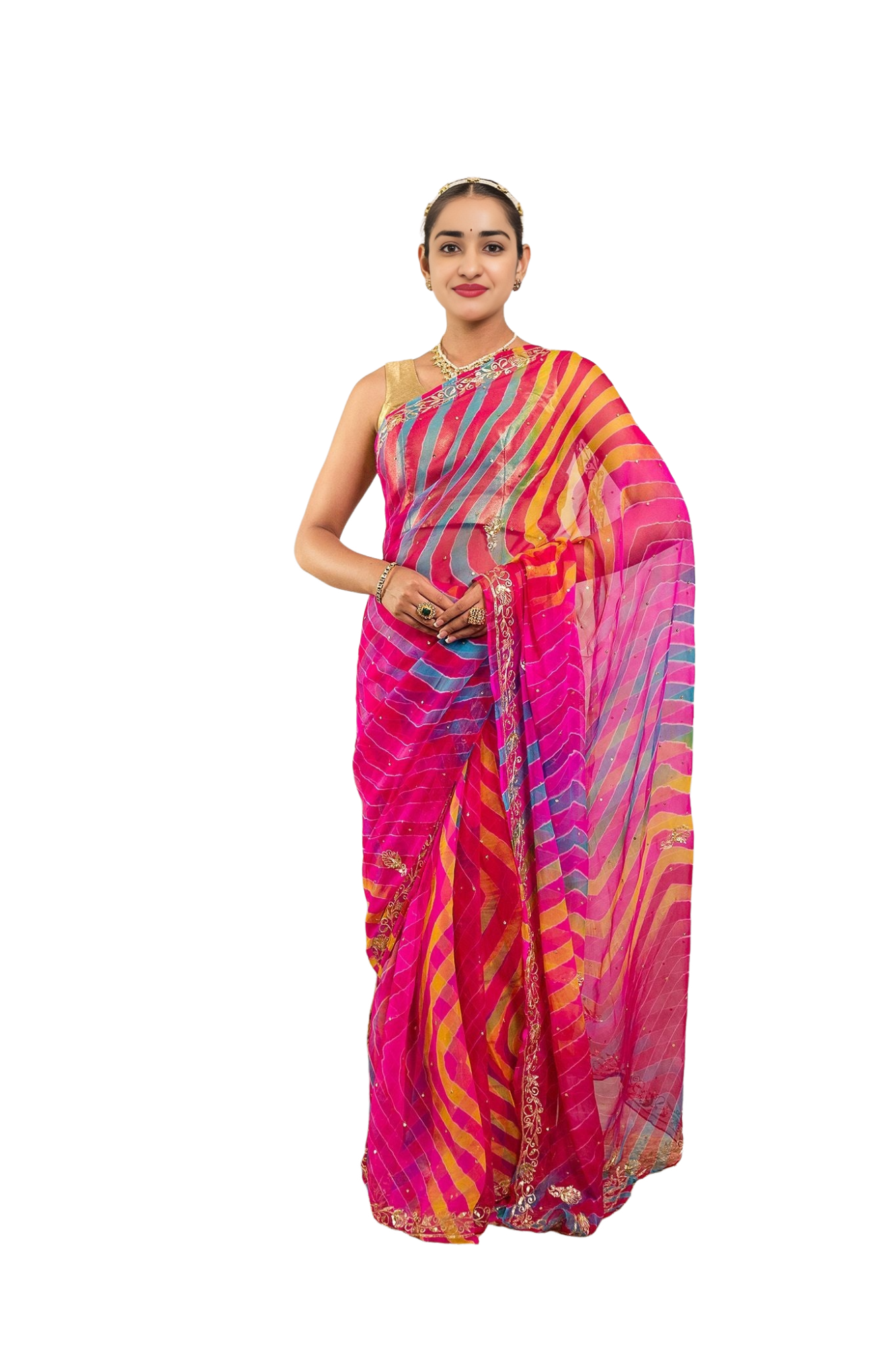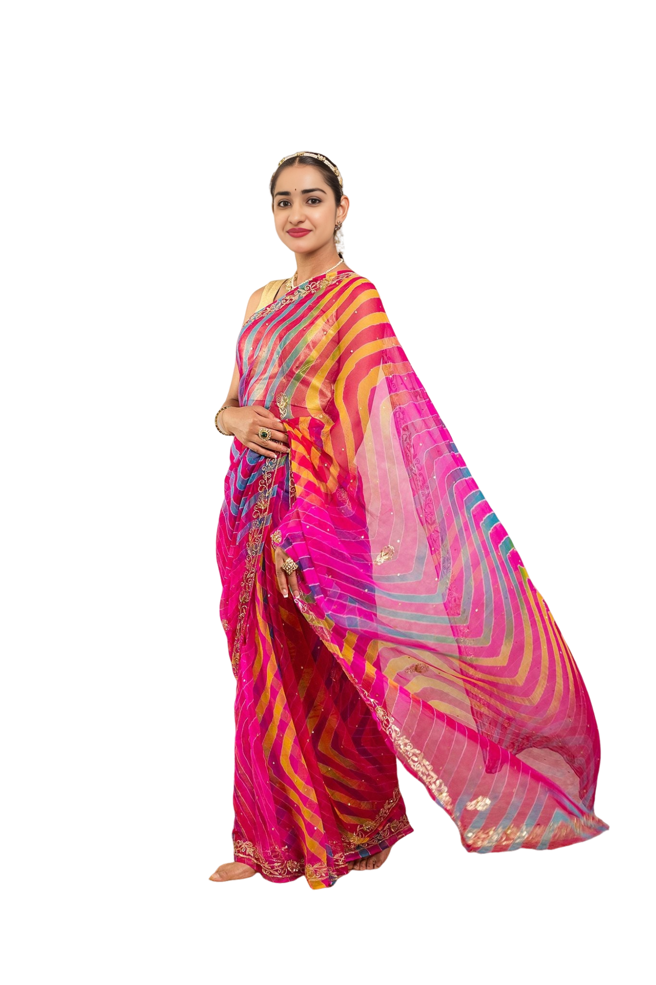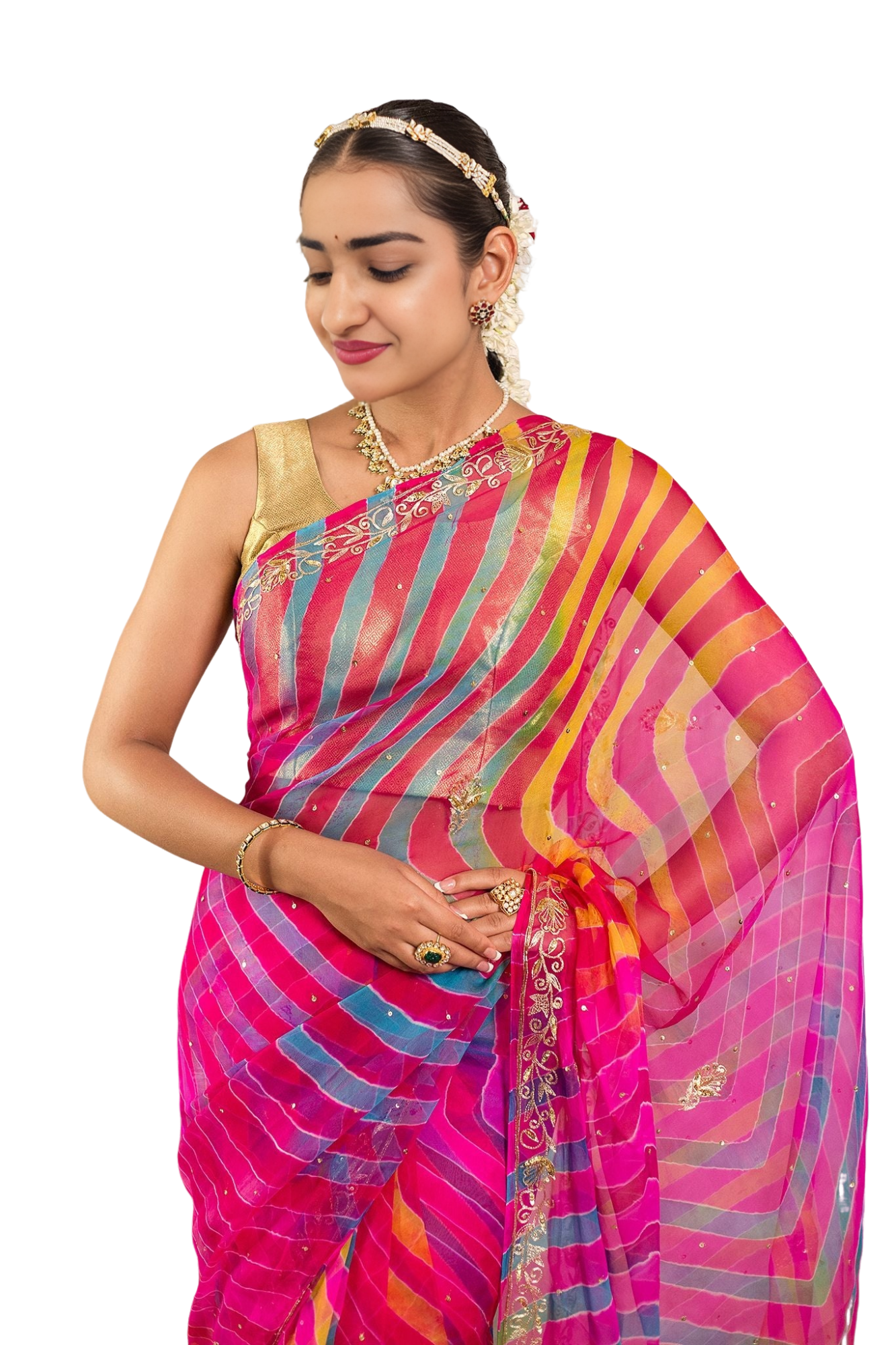 Traditional Elegance Redefined Experience the timeless beauty of traditional craftsmanship through our meticulously created Multi Coloured Pure Georgette Lehariya Saree. Each piece showcases the intricate artistry of triple handwork.