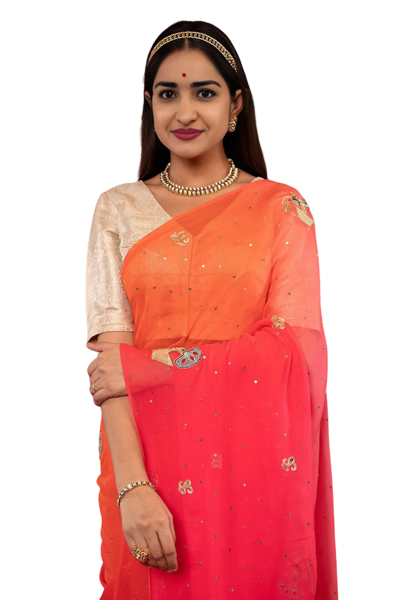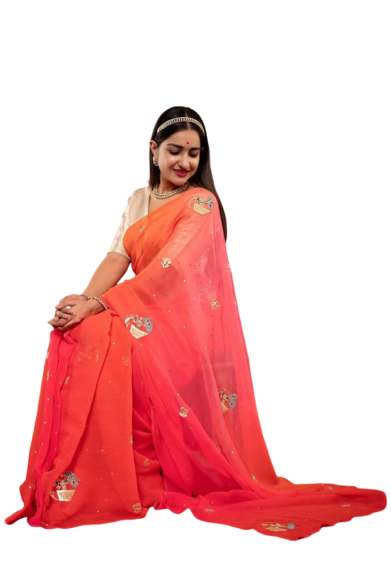The pure chiffon base provides the perfect canvas for the intricate silver work while ensuring comfort and elegant draping. The shaded effect transitions beautifully from orange to pink.