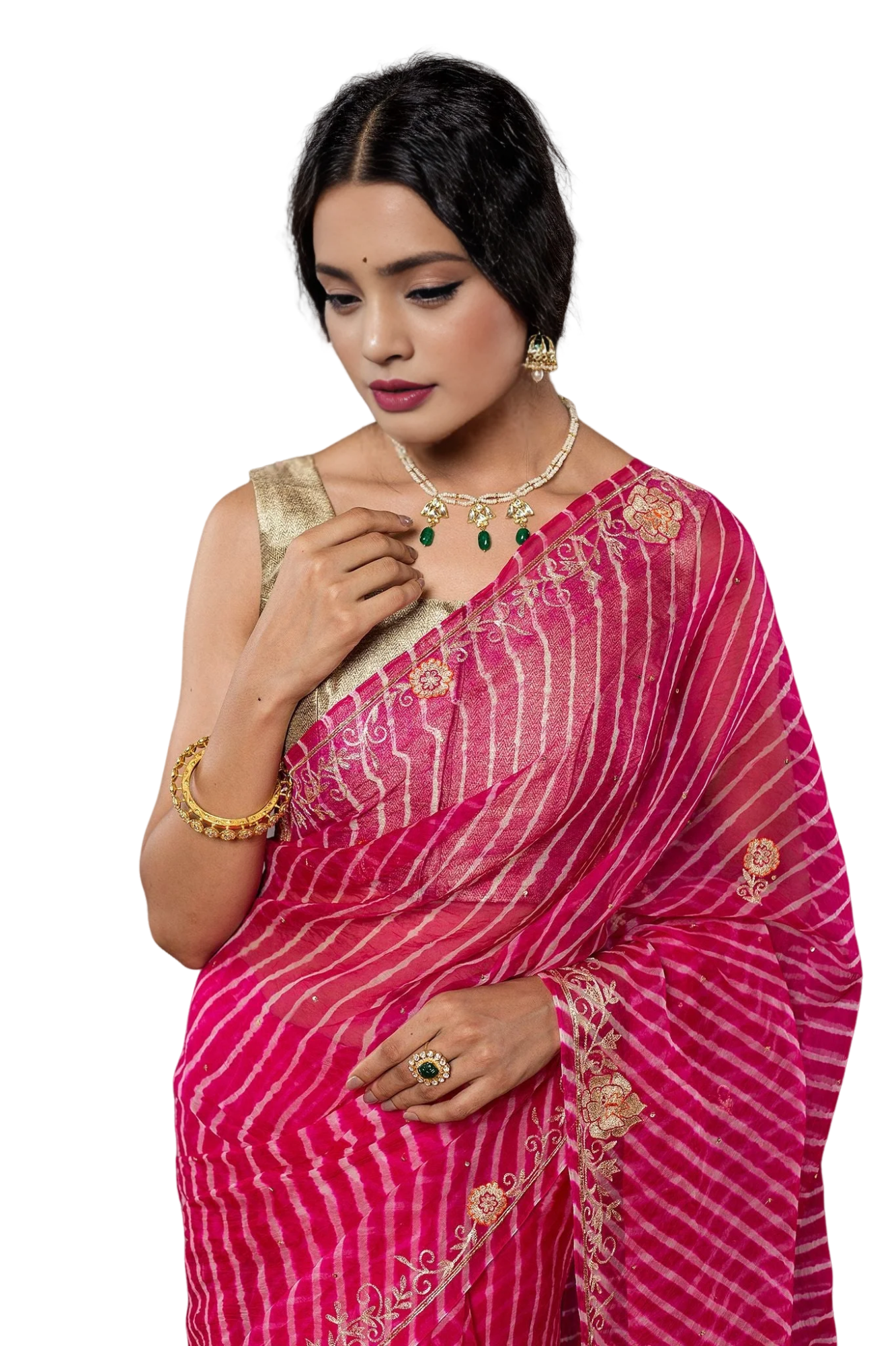 Experience the perfect fusion of traditional Lehariya pattern with contemporary craftsmanship in our Pink Lehariya Saree.