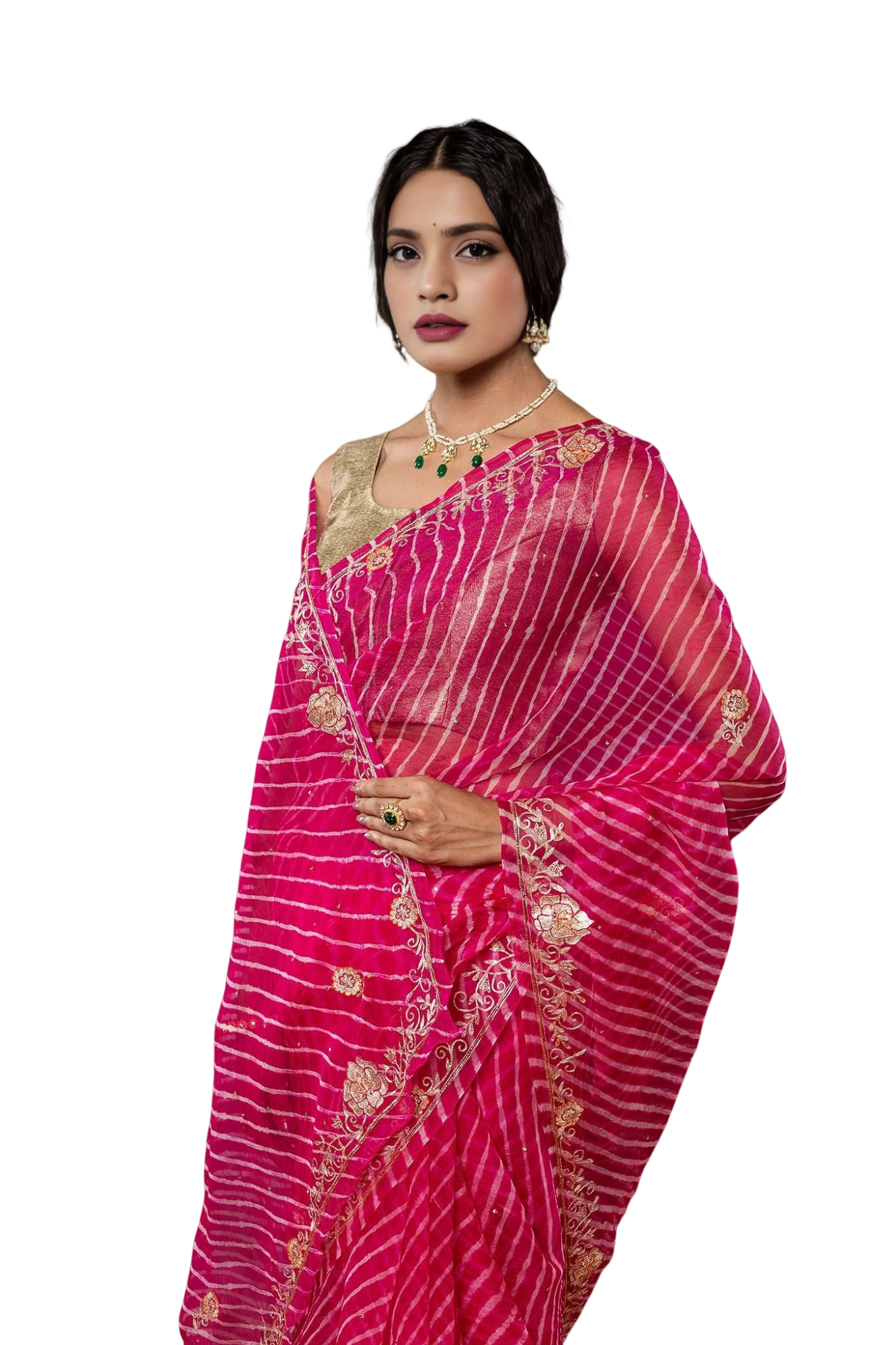 ✨ Embrace traditional charm with our Pink Lehariya Saree. Featuring intricate Zari, Resham, and Salma work on premium 20gm Georgette fabric. The magenta hue combined with traditional Lehariya pattern creates a perfect blend of classic and contemporary style.