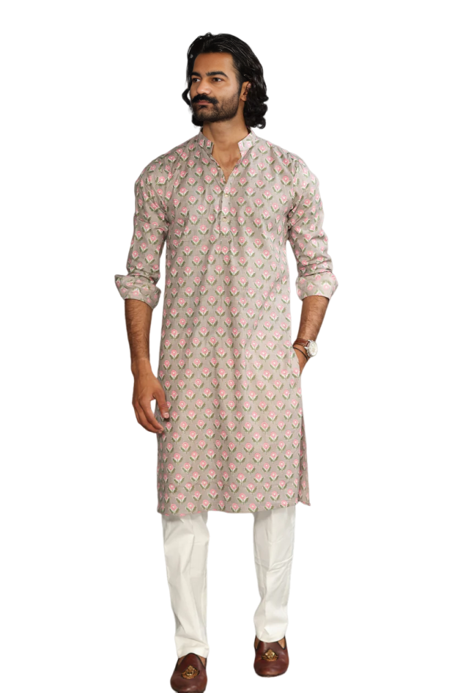 Our Thunder Grey Sanganeri Booti Print Kurta with White Pyjama addresses each of these bold concerns: