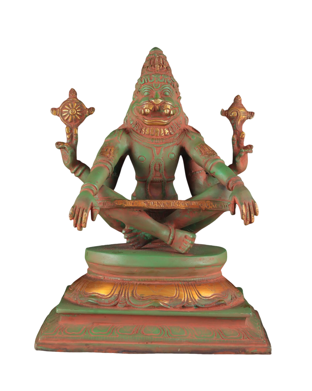 Our Brass Yog Narsimha Statue Antique Green Stone Finish addresses each of these sophisticated meditative challenges: