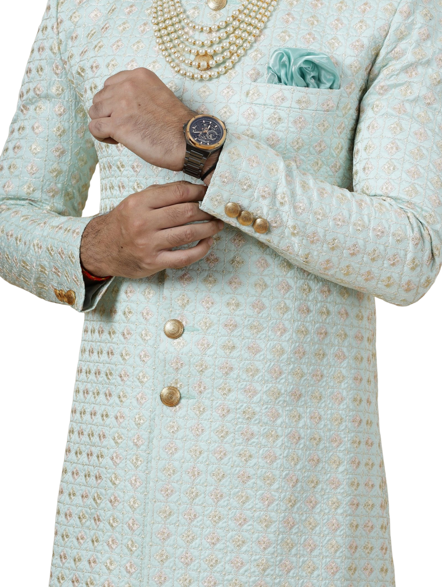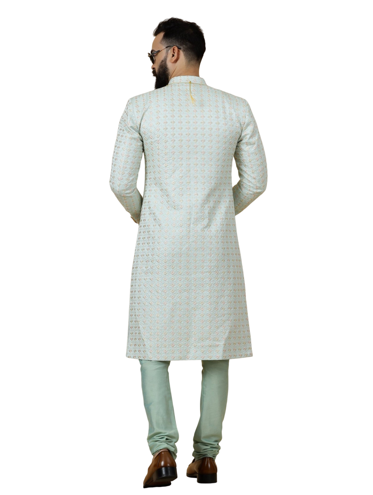 ✨ Experience royal elegance with our Mint Green Floral Thread Embroidered Sherwani. Featuring intricate floral patterns in delicate thread work. Available in father-son matching style. Perfect for weddings and groom ceremonies.