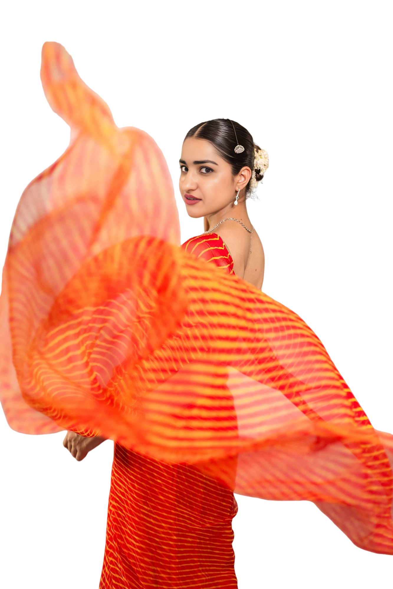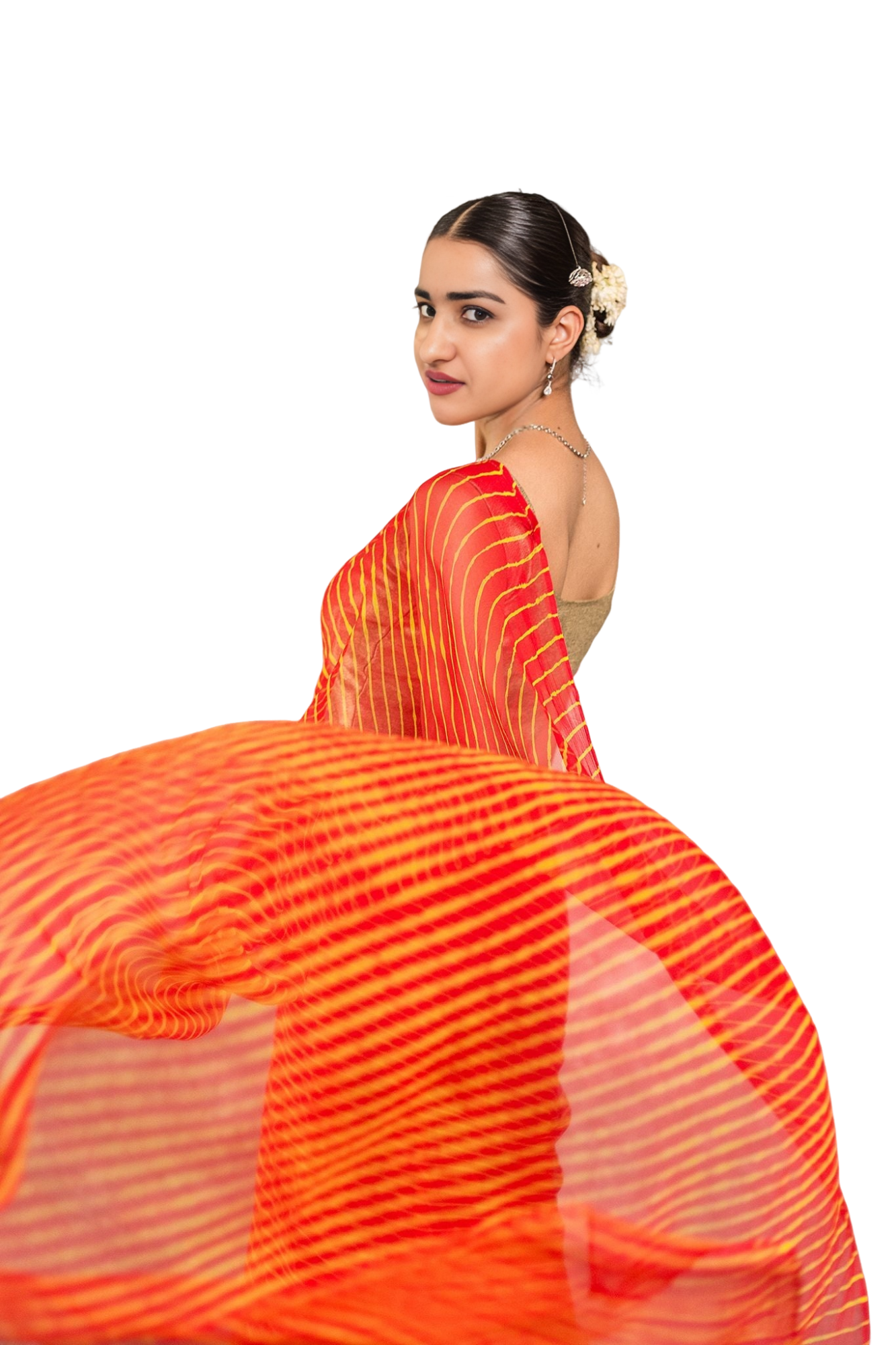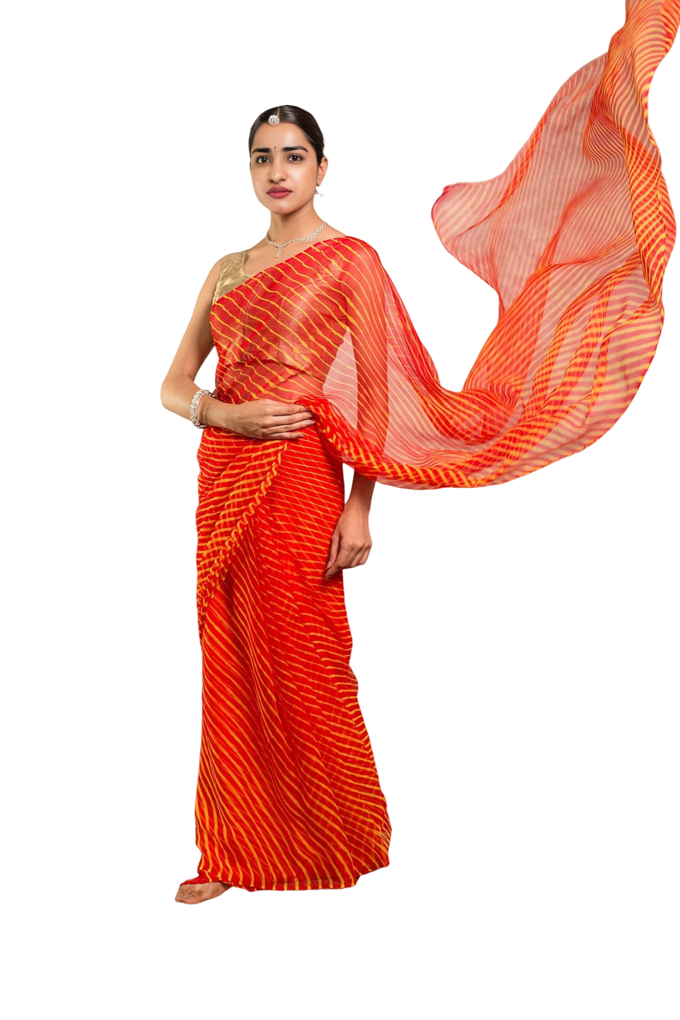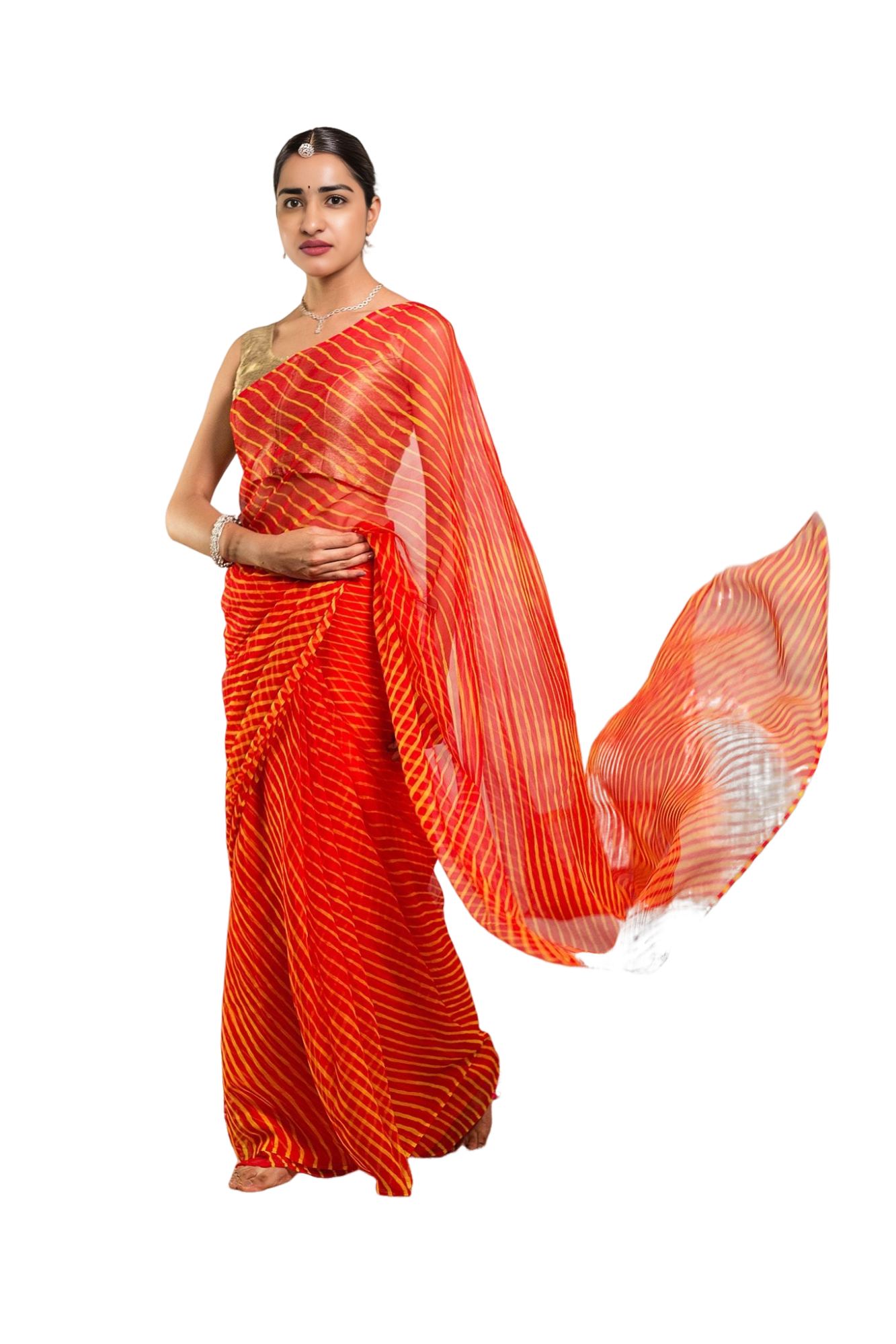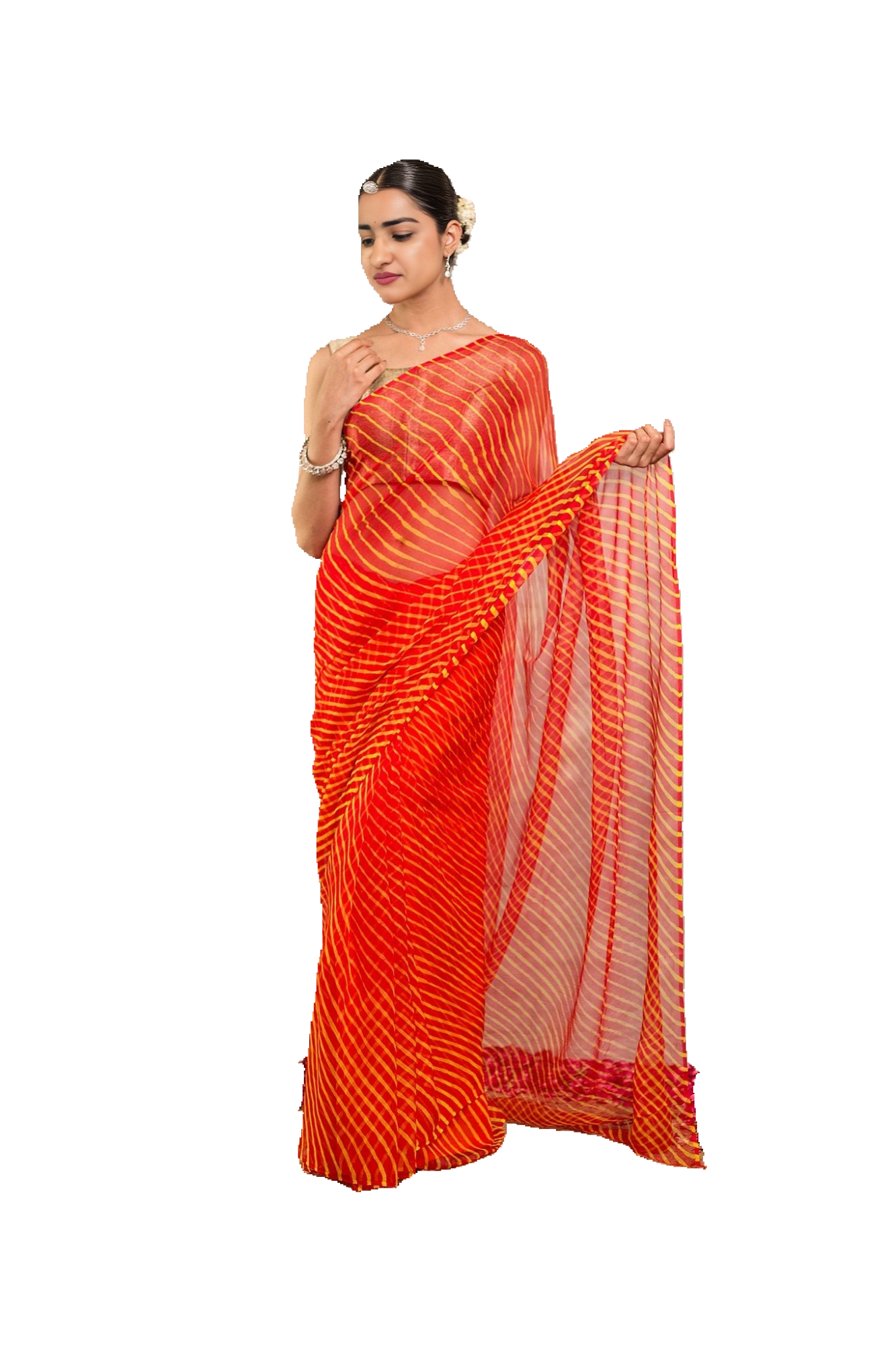 Experience the timeless appeal of traditional Lehariya pattern in our Orange Pure Georgette Saree.