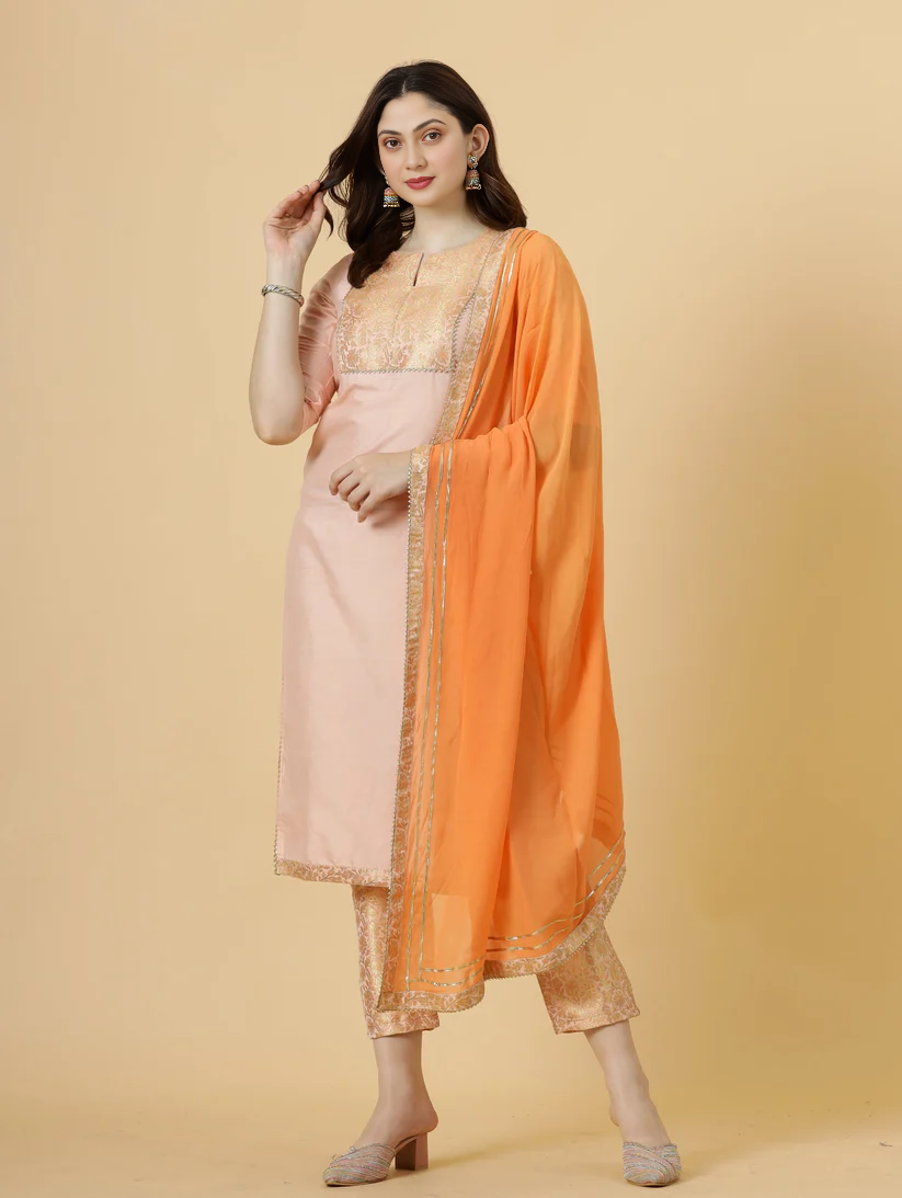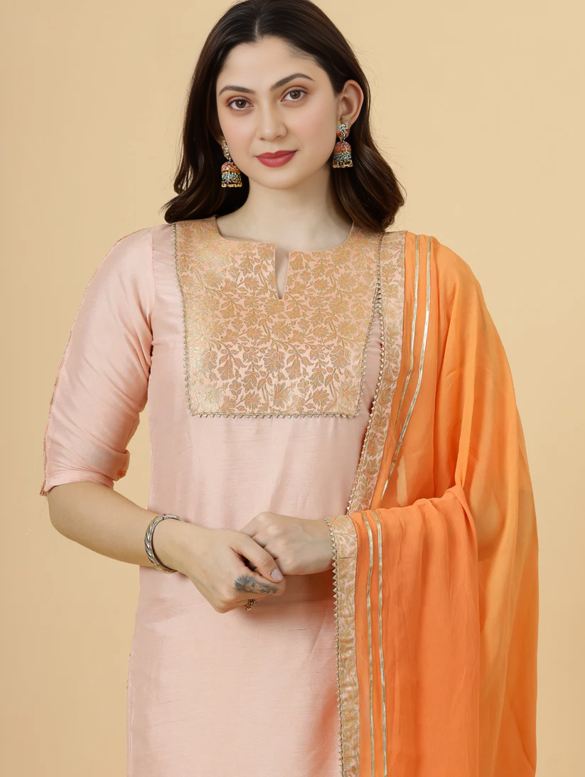 Our Peach Silk Kurti Brocade Pants Set addresses every luxury need: